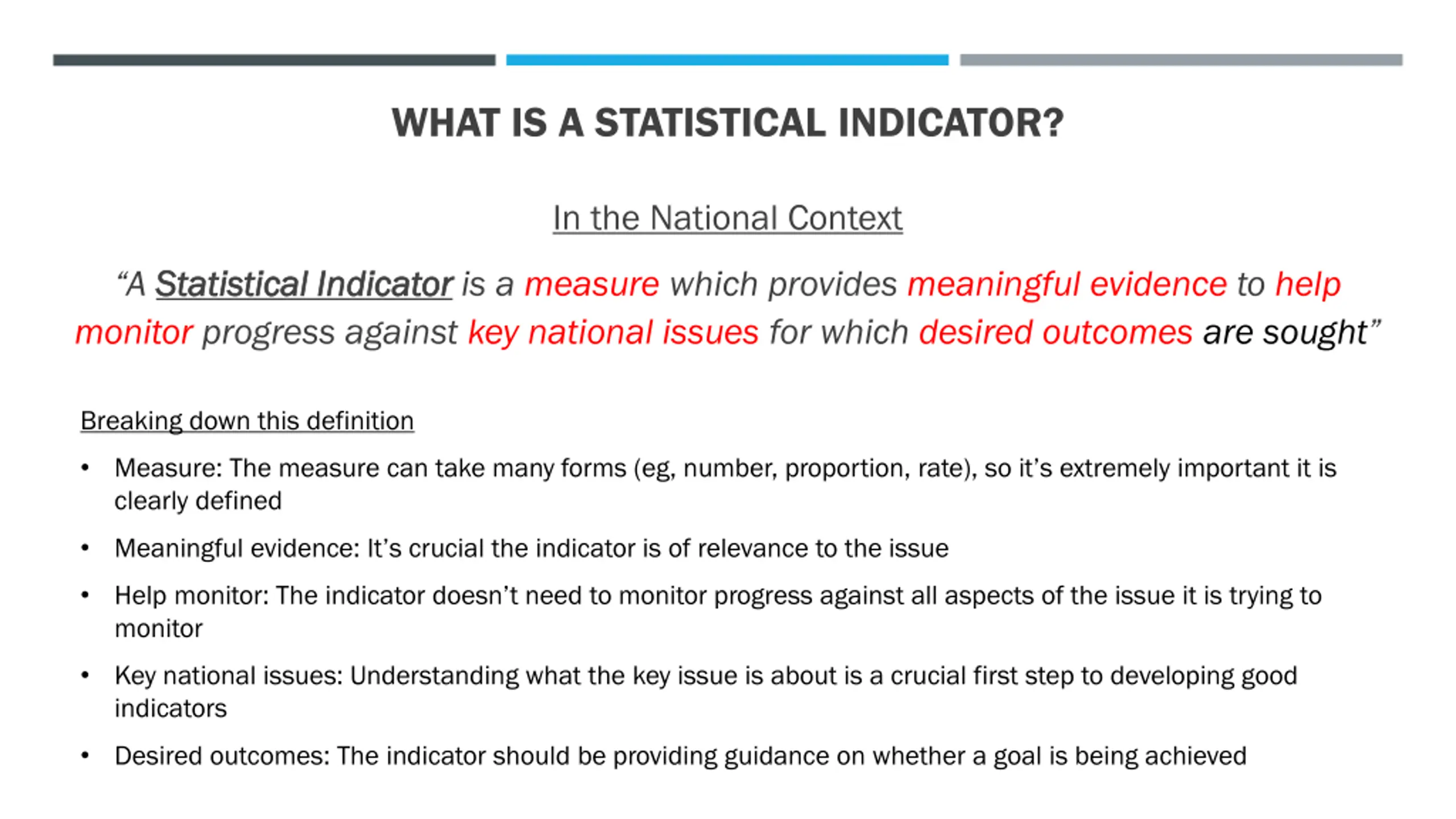 WHAT IS A STATISTICAL INDICATOR? In the National Context A Statistical Indicator Statistical Indicator is a measure which provides meaningful evidence to help monitor progress against key national issues for which desired outcomes are sought Breaking down this definition Measure: The measure can take many forms (eg, number, proportion, rate), so it s extremely important it is clearly defined Meaningful evidence: It s crucial the indicator is of relevance to the issue Help monitor: The indicator doesn t need to monitor progress against all aspects of the issue it is trying to monitor Key national issues: Understanding what the key issue is about is a crucial first step to developing good indicators Desired outcomes: The indicator should be providing guidance on whether a goal is being achieved