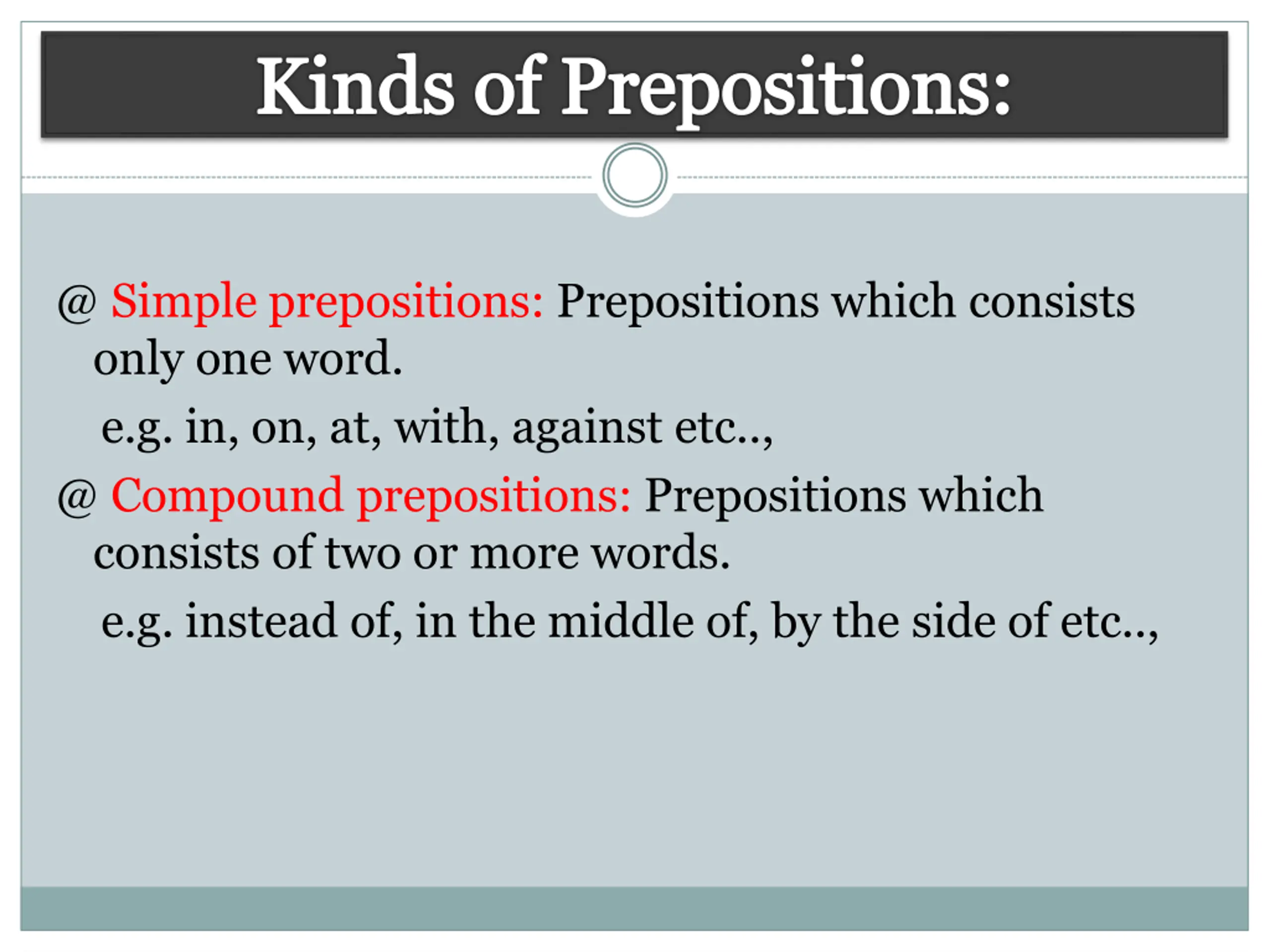 Kinds of Prepositions: @ Simple prepositions: Prepositions which consists only one word. e.g. in, on, at, with, against etc.., @ Compound prepositions: Prepositions which consists of two or more words. e.g. instead of, in the middle of, by the side of etc..,