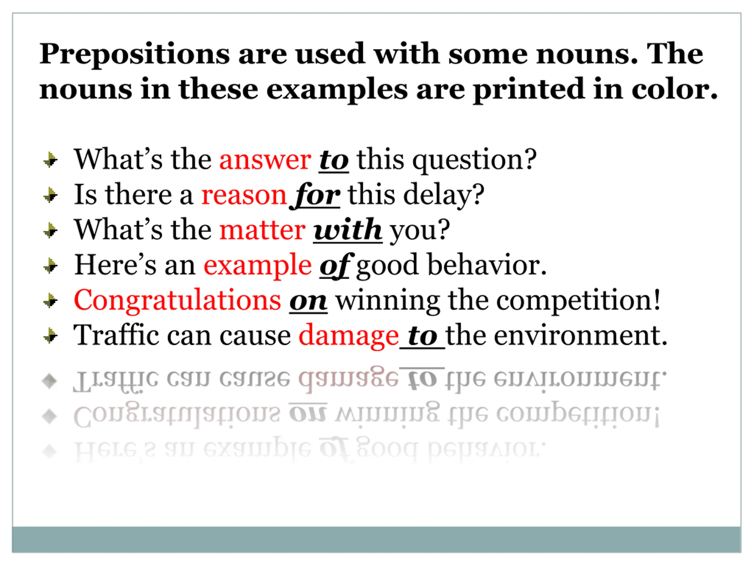 Prepositions are used with some nouns. The nouns in these examples are printed in color. What s the answer to this question? Is there a reason for this delay? What s the matter with you? Here s an example of good behavior. Congratulations on winning the competition! Traffic can cause damage to the environment.