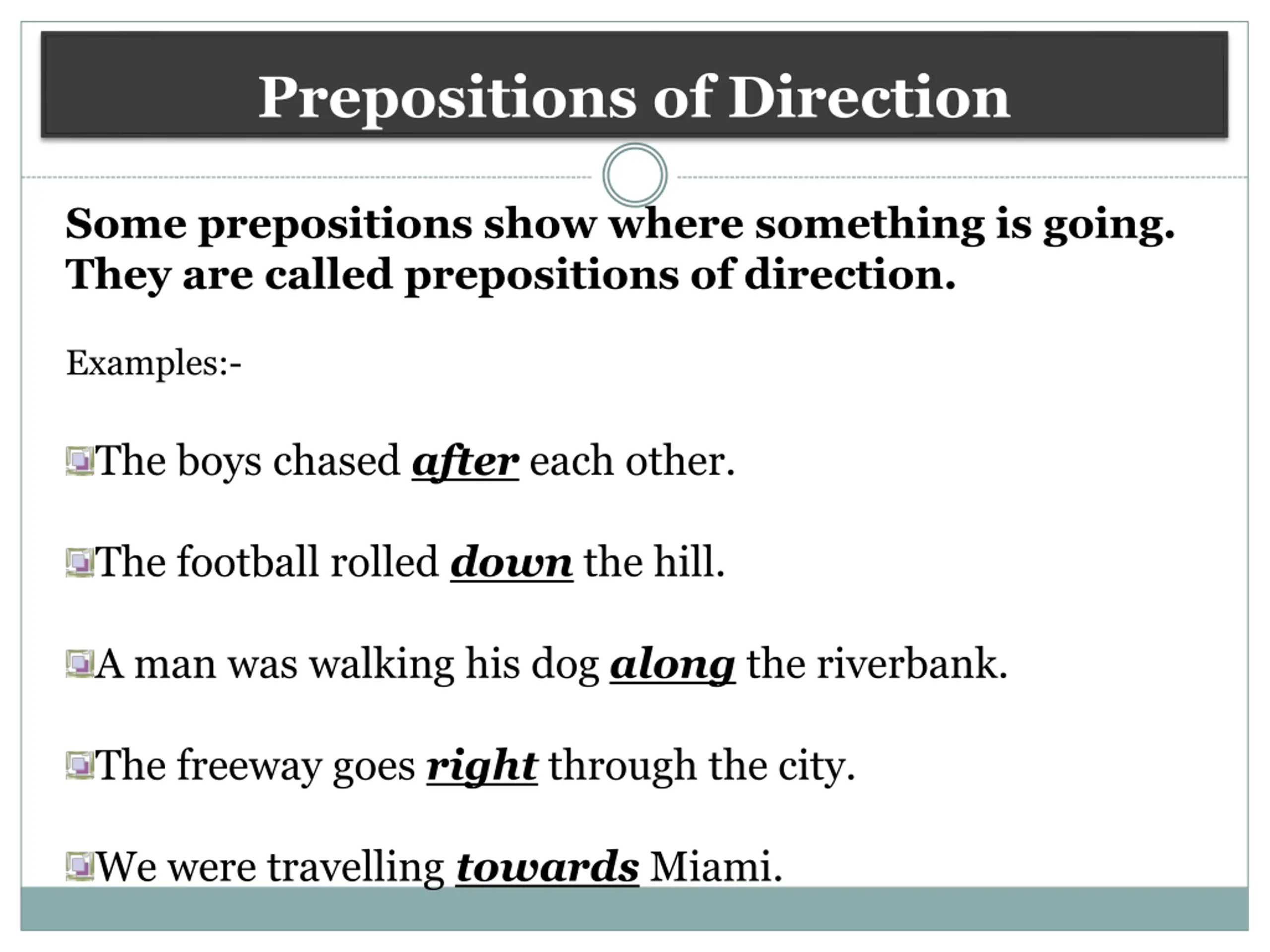 Prepositions of Direction Some prepositions show where something is going. They are called prepositions of direction. Examples:- The boys chased after each other. The football rolled down the hill. A man was walking his dog along the riverbank. The freeway goes right through the city. We were travelling towards Miami.