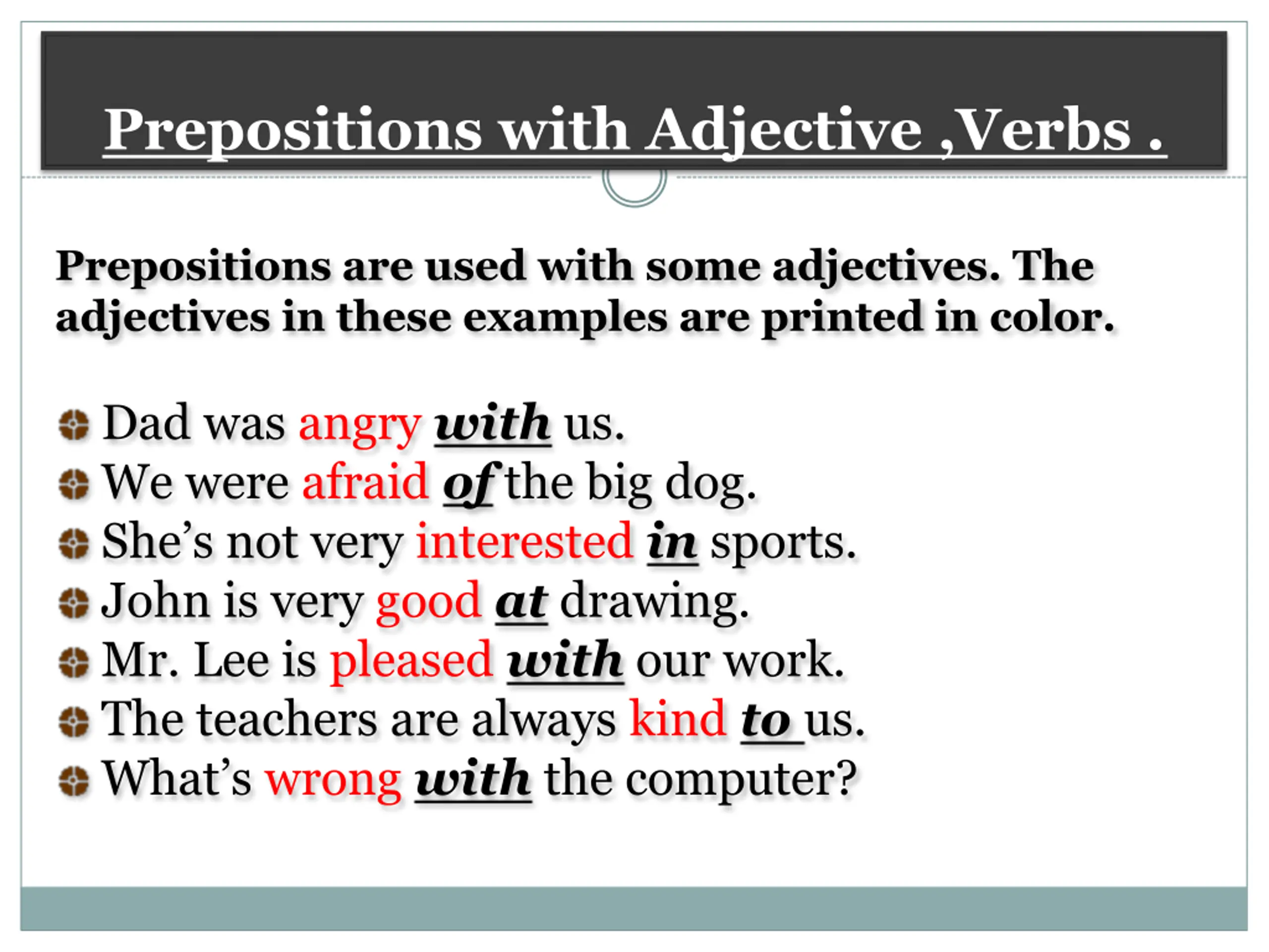 Prepositions with Adjective ,Verbs . Prepositions are used with some adjectives. The adjectives in these examples are printed in color. Dad was angry with us. We were afraid of the big dog. She s not very interested in sports. John is very good at drawing. Mr. Lee is pleased with our work. The teachers are always kind to us. What s wrong with the computer?