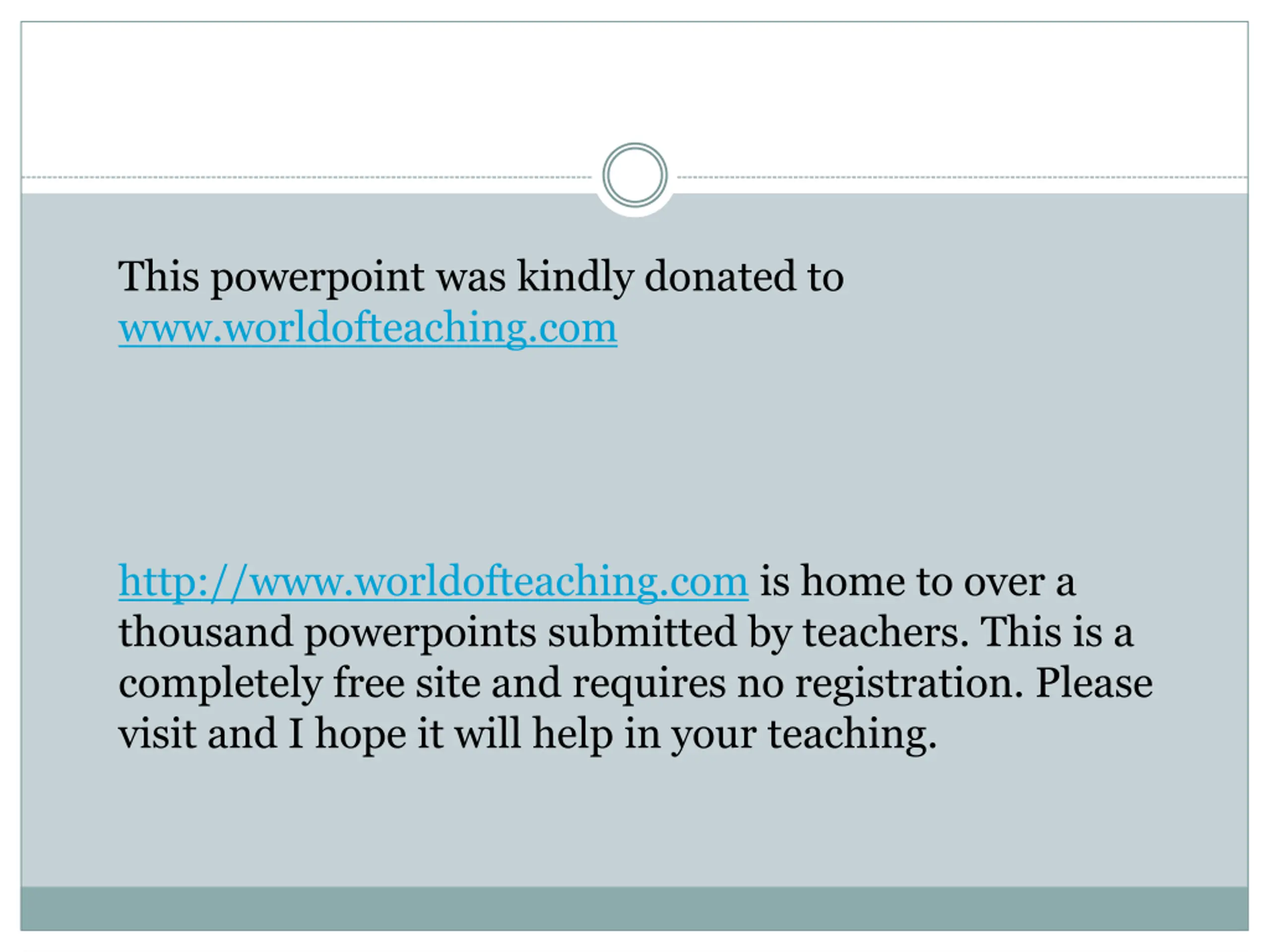 This powerpoint was kindly donated to www.worldofteaching.com http://www.worldofteaching.com is home to over a thousand powerpoints submitted by teachers. This is a completely free site and requires no registration. Please visit and I hope it will help in your teaching.