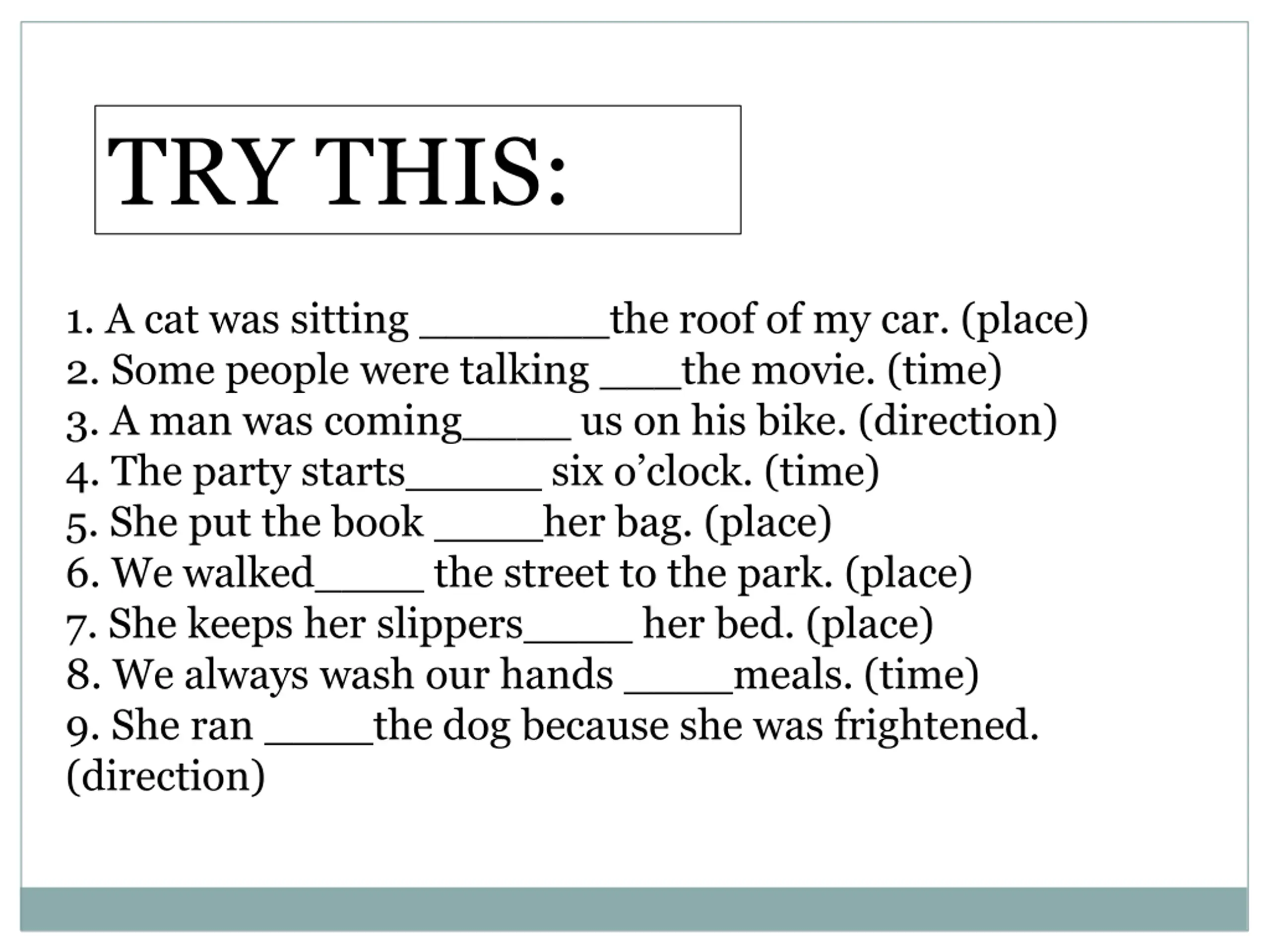TRY THIS: 1. A cat was sitting _______the roof of my car. (place) 2. Some people were talking ___the movie. (time) 3. A man was coming____ us on his bike. (direction) 4. The party starts_____ six o clock. (time) 5. She put the book ____her bag. (place) 6. We walked____ the street to the park. (place) 7. She keeps her slippers____ her bed. (place) 8. We always wash our hands ____meals. (time) 9. She ran ____the dog because she was frightened. (direction)