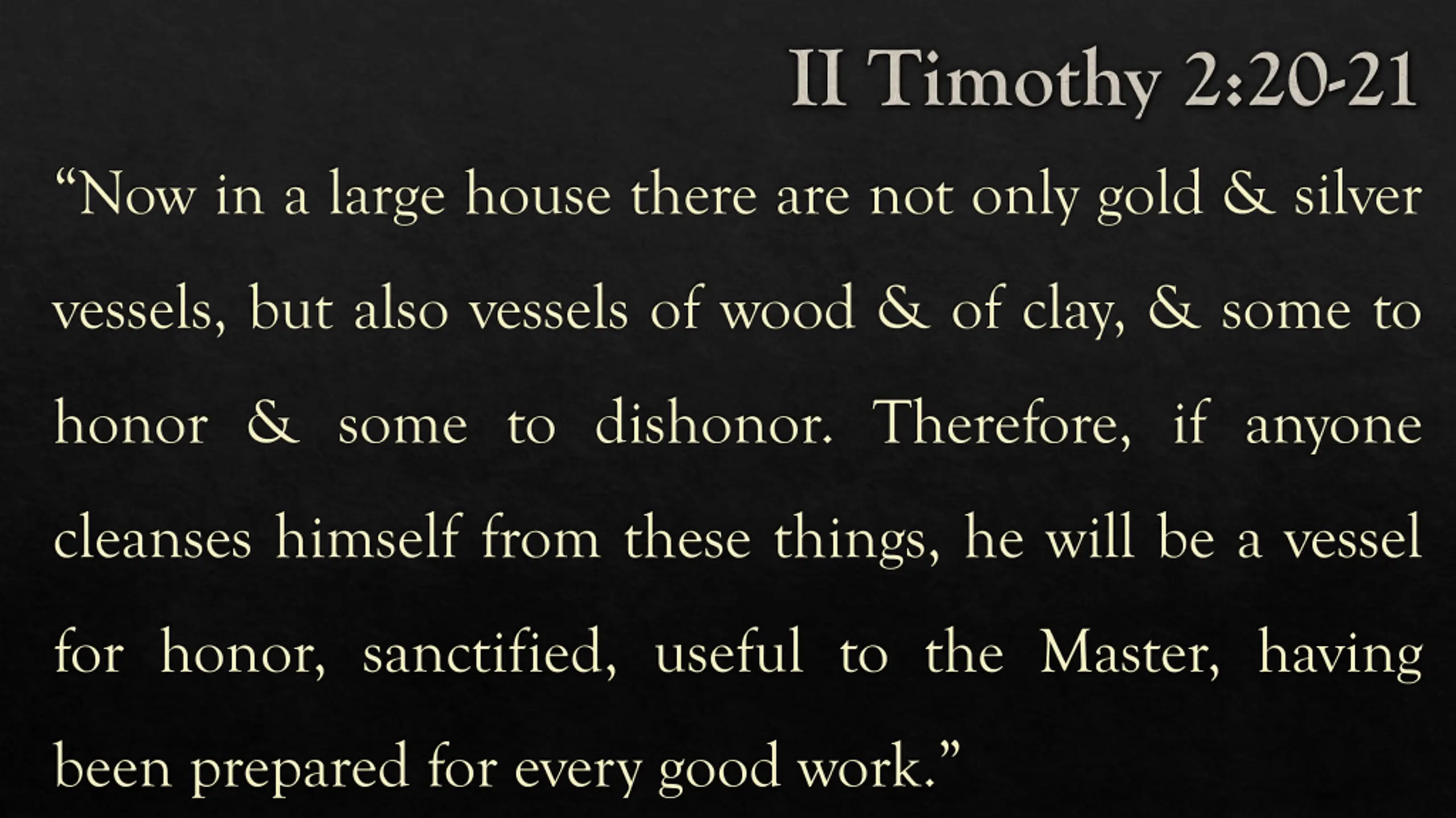 II Timothy 2:20-21 Now in a large house there are not only gold & silver vessels, but also vessels of wood & of clay, & some to honor & some to dishonor. Therefore, if anyone cleanses himself from these things, he will be a vessel for honor, sanctified, useful to the Master, having been prepared for every good work.