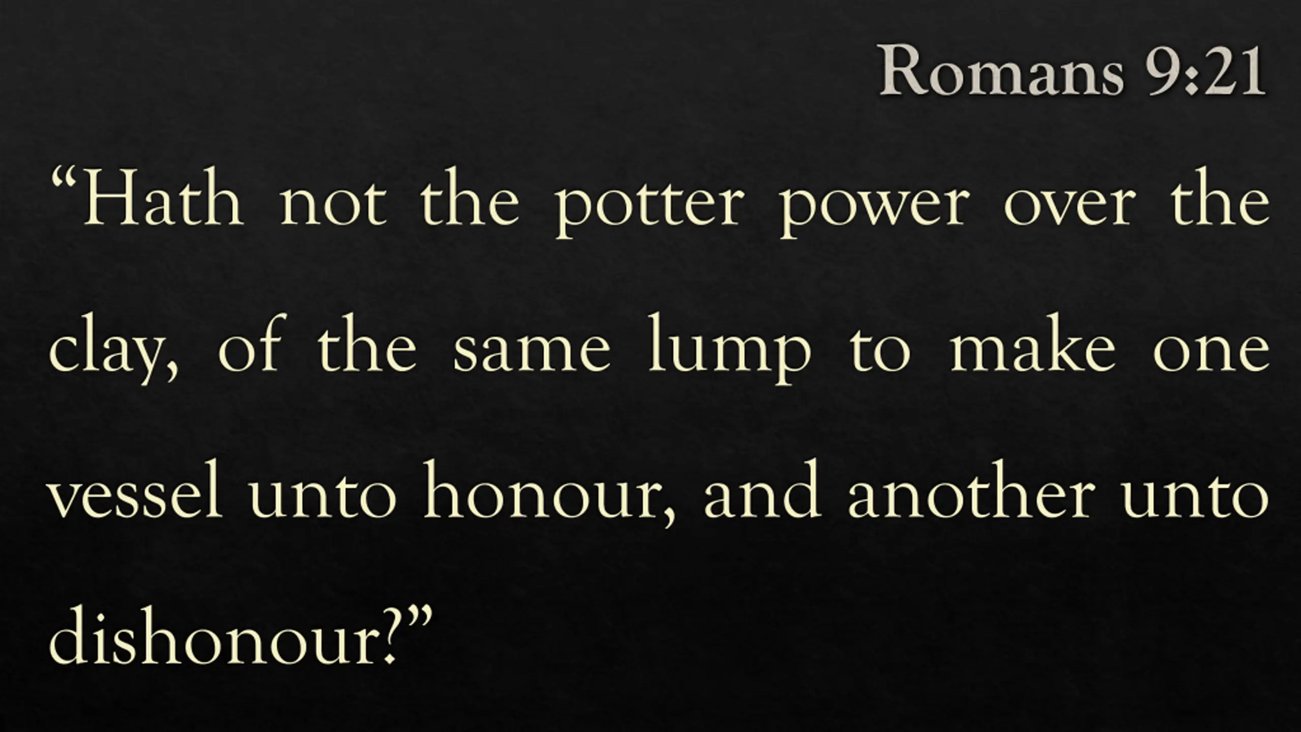Romans 9:21 Hath not the potter power over the clay, of the same lump to make one vessel unto honour, and another unto dishonour?