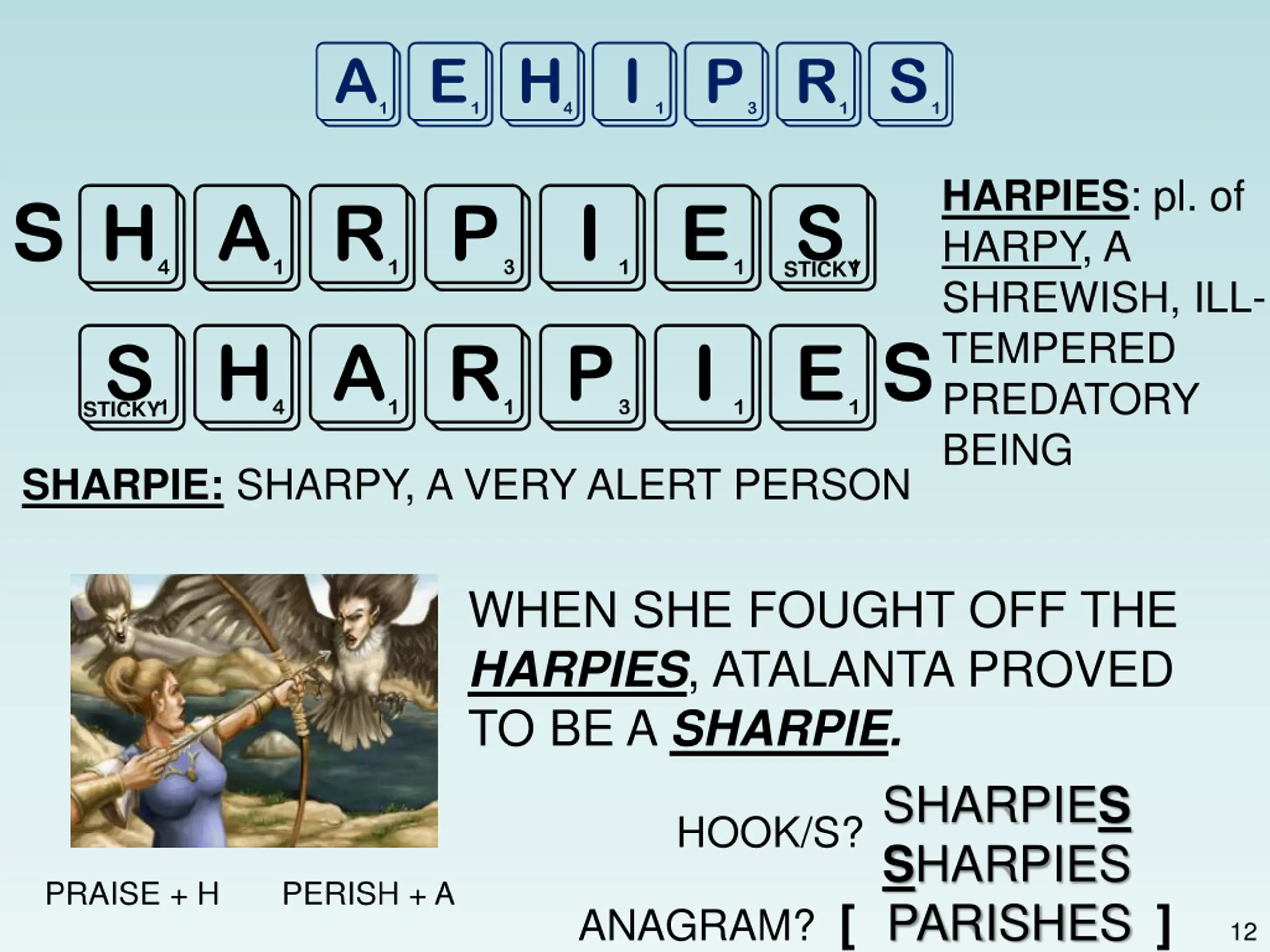 AEHIPRS HARPIES: pl. of HARPY, A SHREWISH, ILL- TEMPERED PREDATORY BEING HARPIES SHARPIE S STICKY S STICKY SHARPIE: SHARPY, A VERY ALERT PERSON WHEN SHE FOUGHT OFF THE HARPIES, ATALANTA PROVED TO BE A SHARPIE. HOOK/S?SHARPIES SHARPIES PARISHES PRAISE + H PERISH + A ANAGRAM? [ ] 12