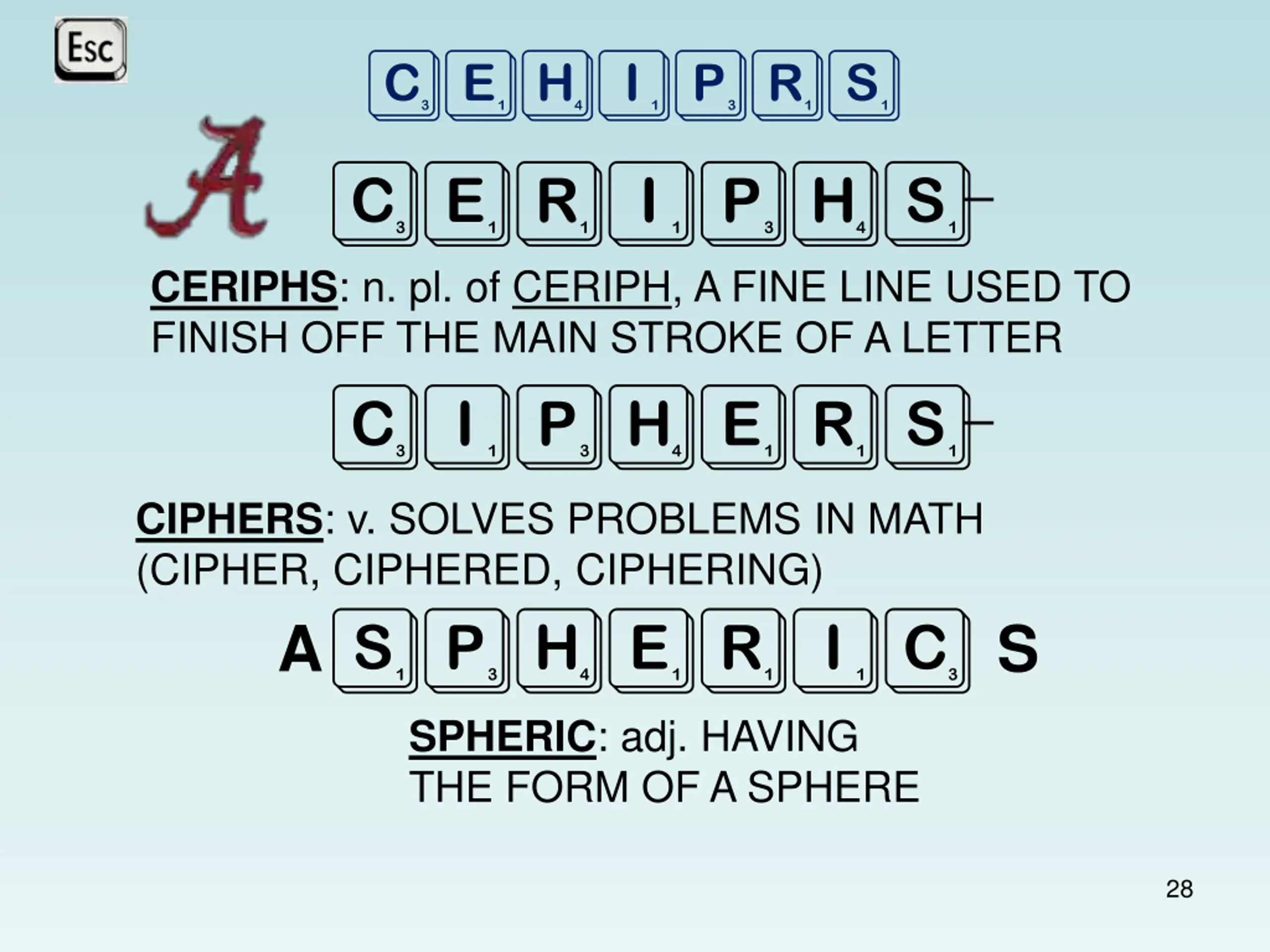 CEHIPRS CERIPHS CERIPHS: n. pl. of CERIPH, A FINE LINE USED TO FINISH OFF THE MAIN STROKE OF A LETTER _ _ CIPHERS CIPHERS: v. SOLVES PROBLEMS IN MATH (CIPHER, CIPHERED, CIPHERING) A SPHERICS SPHERIC: adj. HAVING THE FORM OF A SPHERE 28