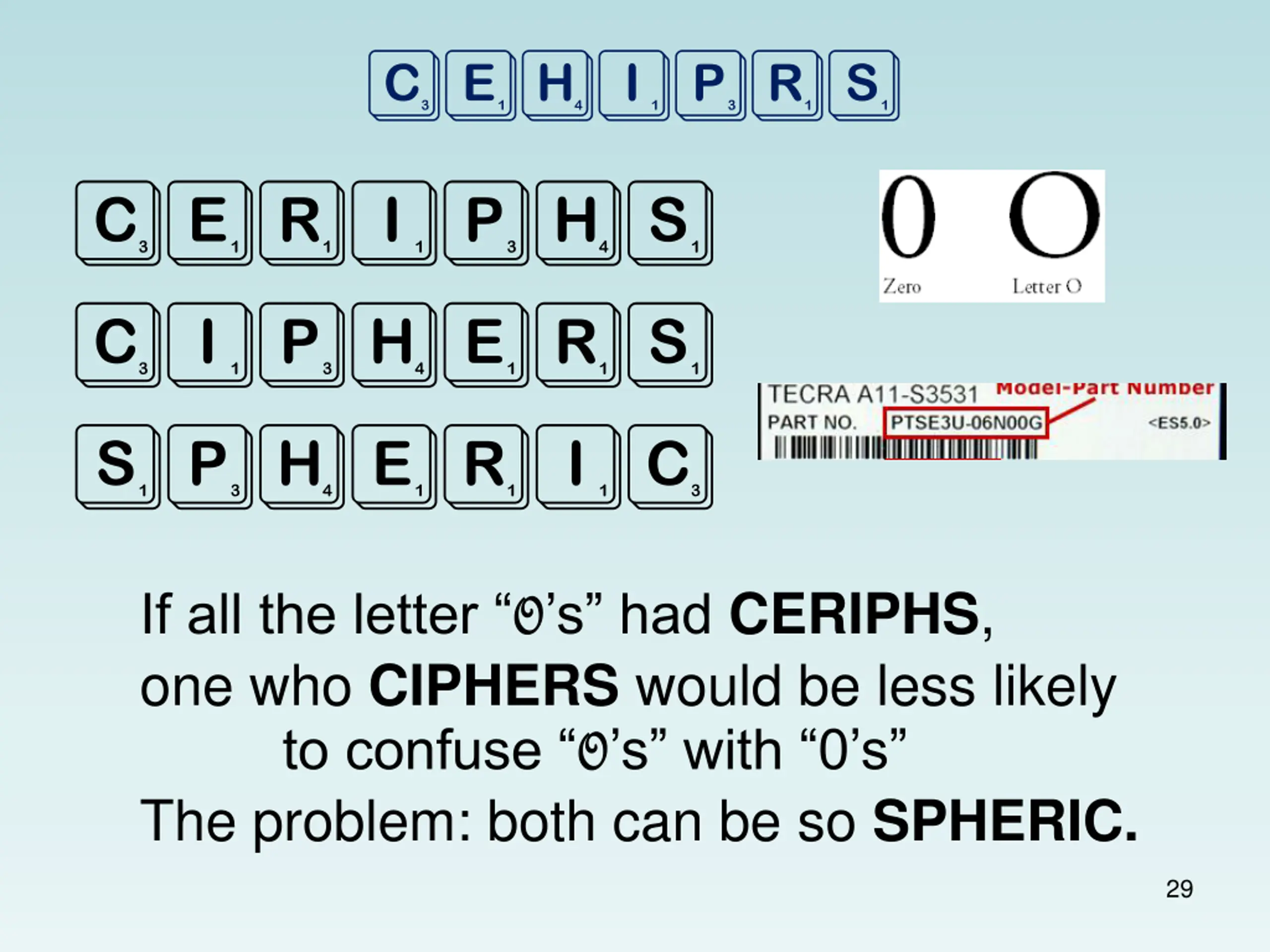 CEHIPRS CERIPHS CIPHERS SPHERIC If all the letter O O s had CERIPHS, one who CIPHERS would be less likely to confuse O O s with 0 s The problem: both can be so SPHERIC. 29