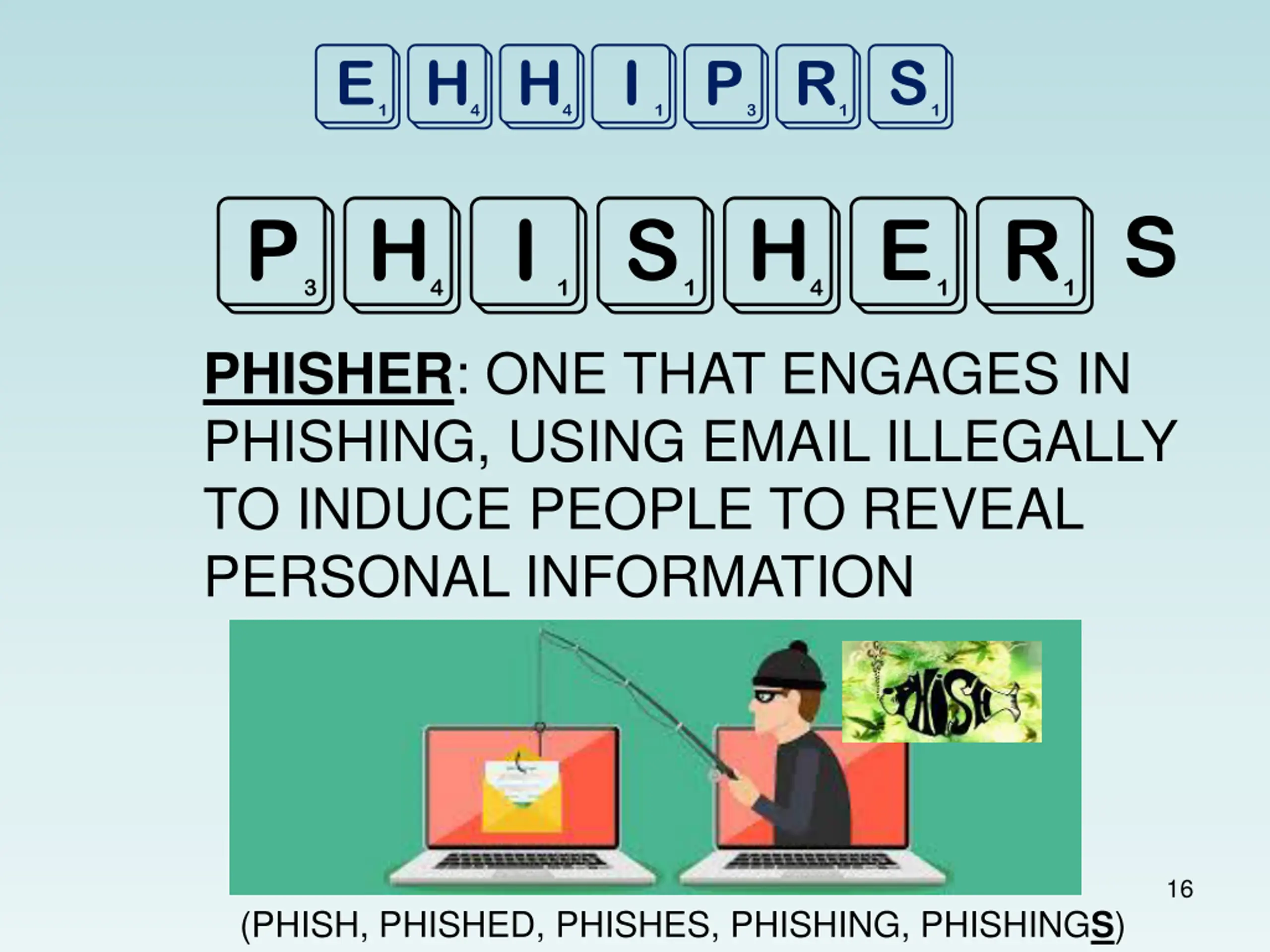 EHHIPRS PHISHERS PHISHER: ONE THAT ENGAGES IN PHISHING, USING EMAIL ILLEGALLY TO INDUCE PEOPLE TO REVEAL PERSONAL INFORMATION 16 (PHISH, PHISHED, PHISHES, PHISHING, PHISHINGS)