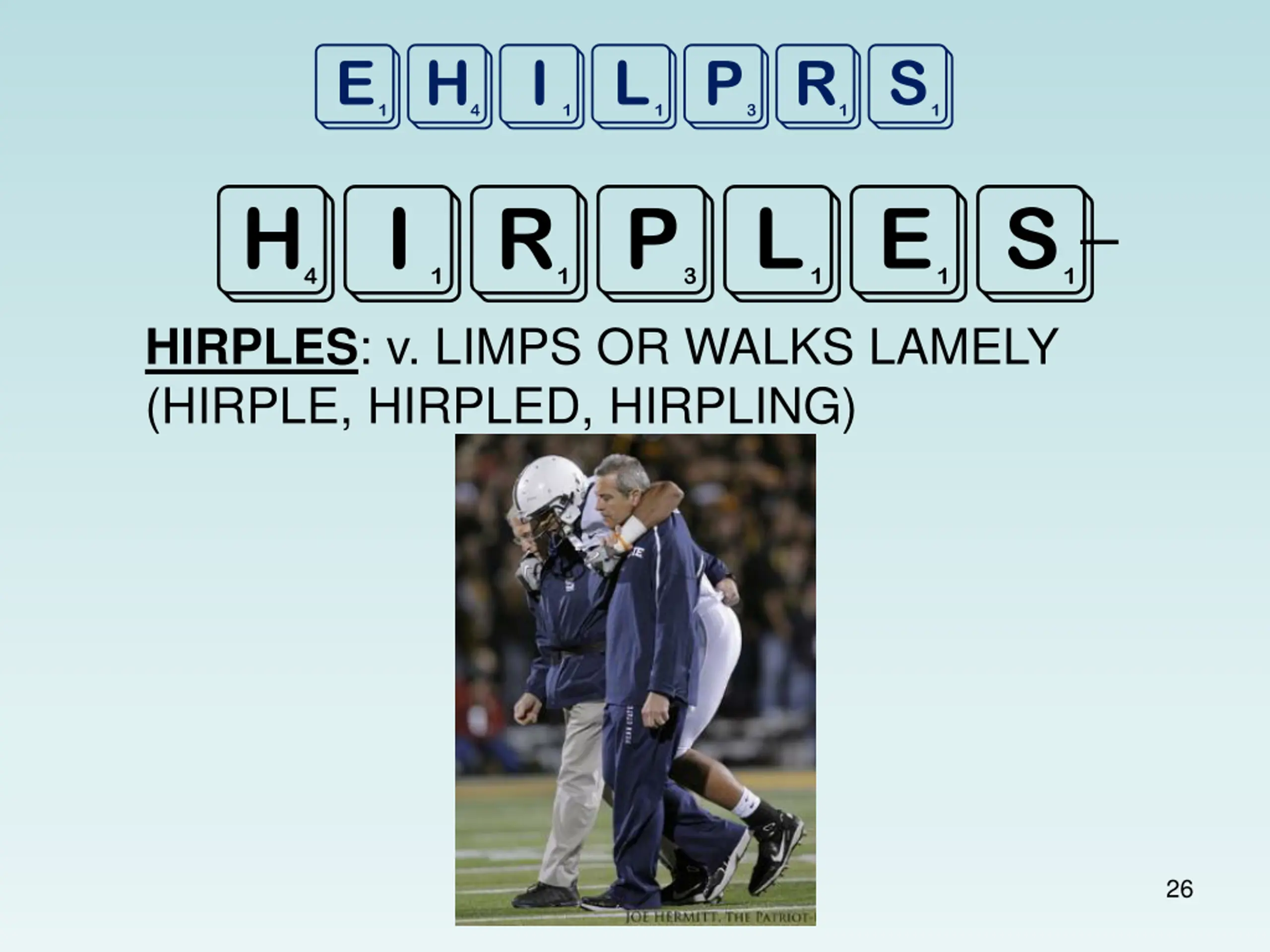 EHILPRS HIRPLES HIRPLES: v. LIMPS OR WALKS LAMELY (HIRPLE, HIRPLED, HIRPLING) _ 26
