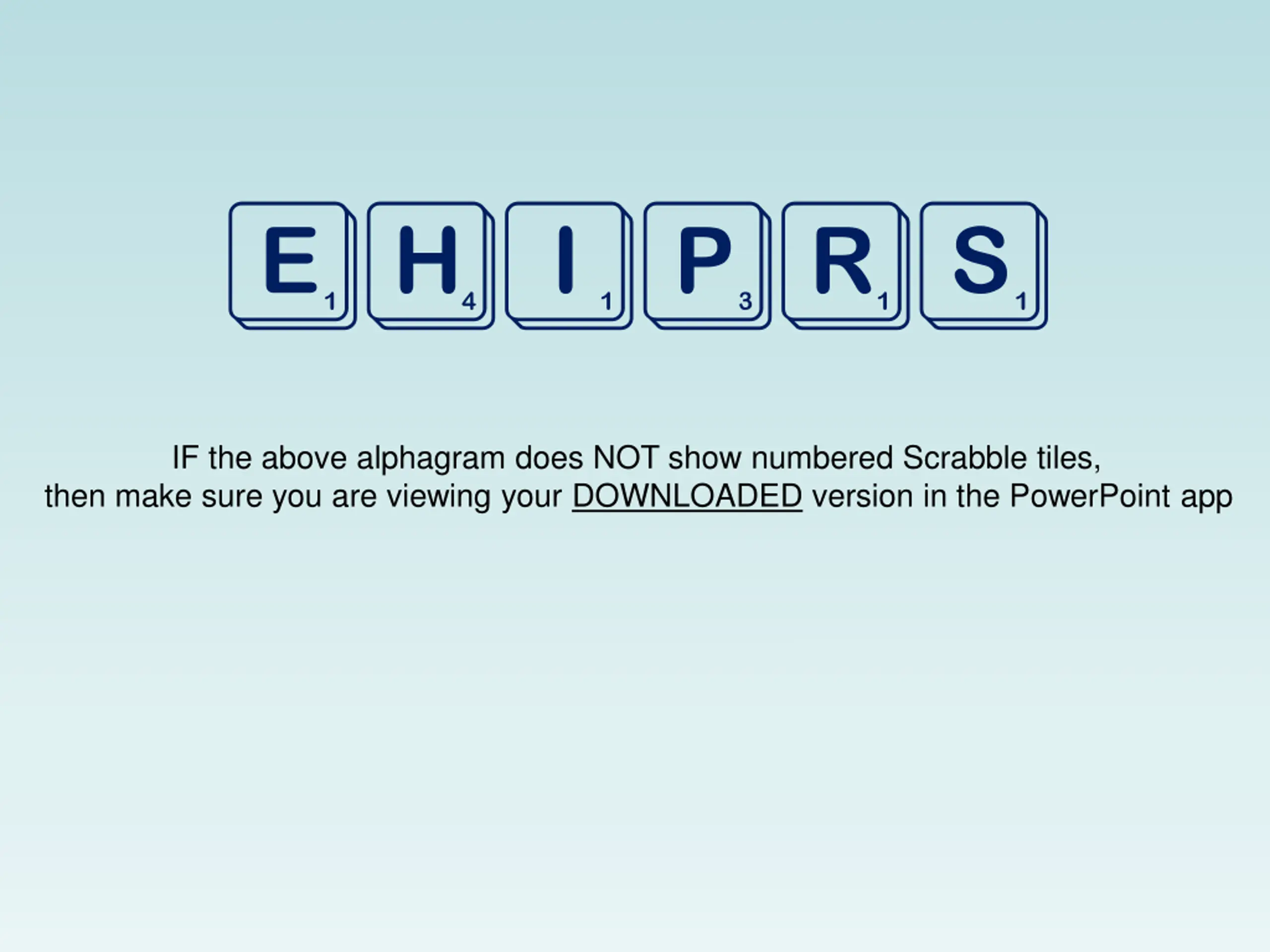 EHIPRS IF the above alphagram does NOT show numbered Scrabble tiles, then make sure you are viewing your DOWNLOADED version in the PowerPoint app