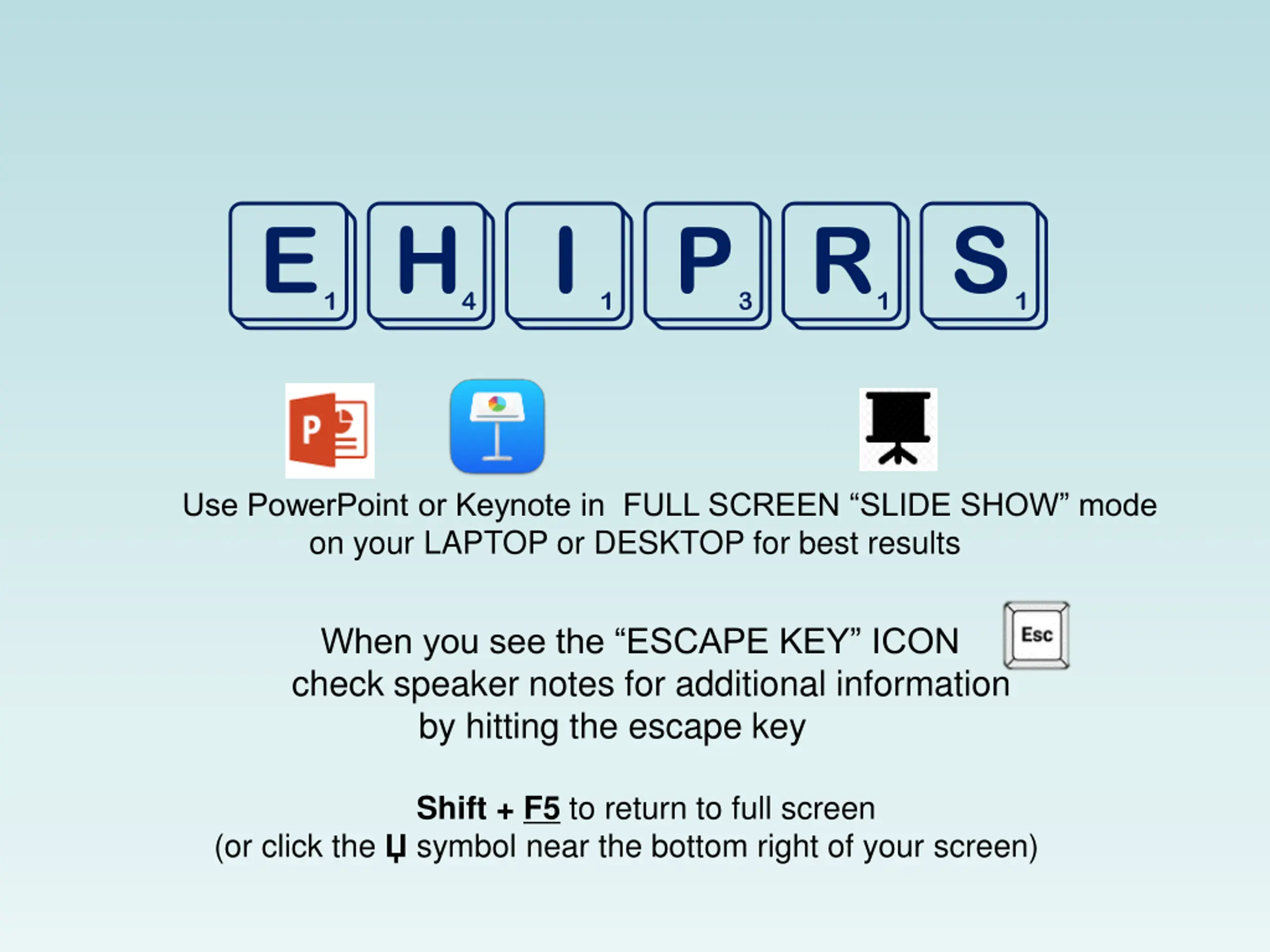 EHIPRS Use PowerPoint or Keynote in FULL SCREEN SLIDE SHOW mode on your LAPTOP or DESKTOP for best results When you see the ESCAPE KEY ICON check speaker notes for additional information by hitting the escape key Shift + F5 to return to full screen (or click the symbol near the bottom right of your screen)