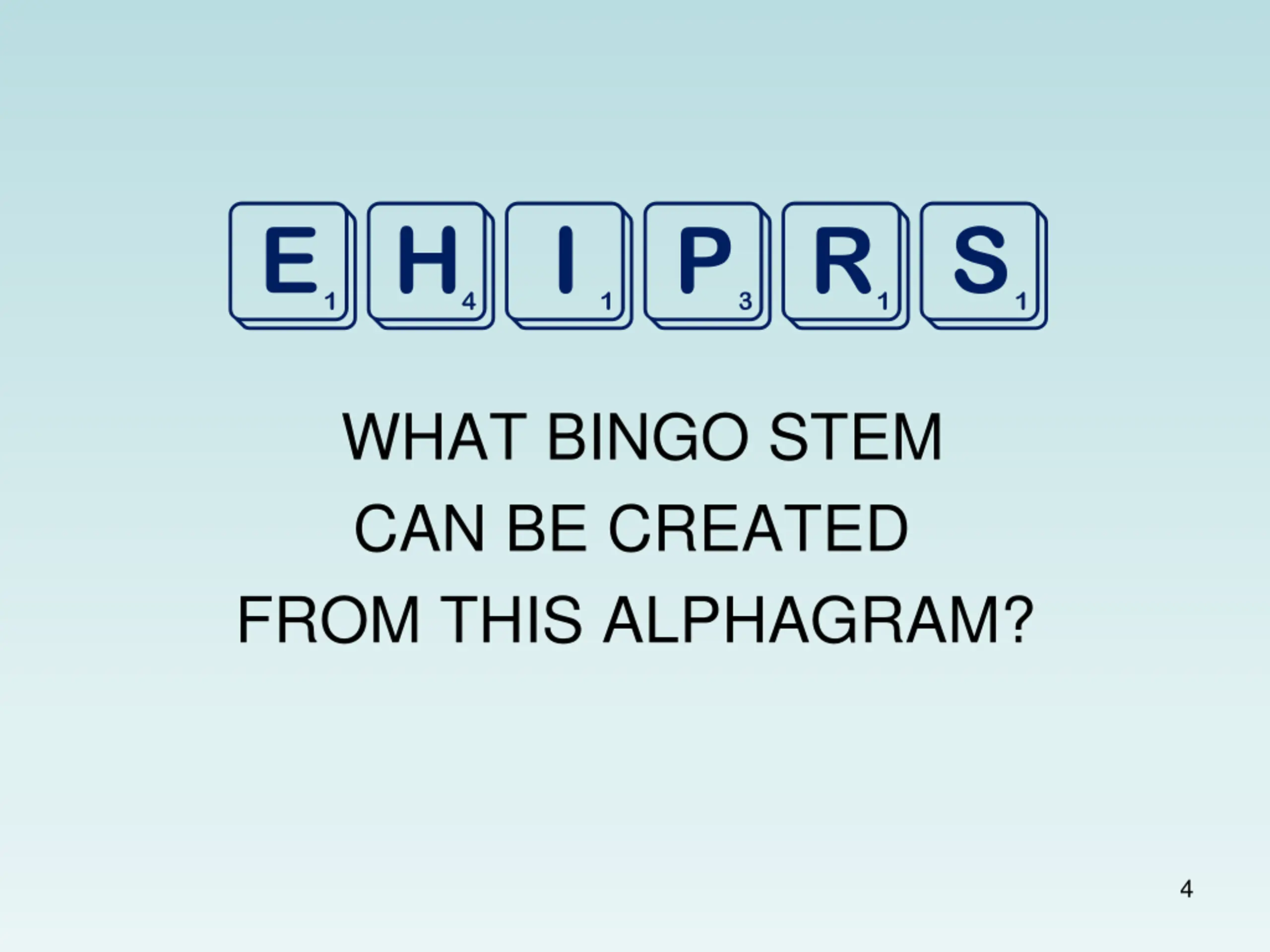 EHIPRS WHAT BINGO STEM CAN BE CREATED FROM THIS ALPHAGRAM? 4