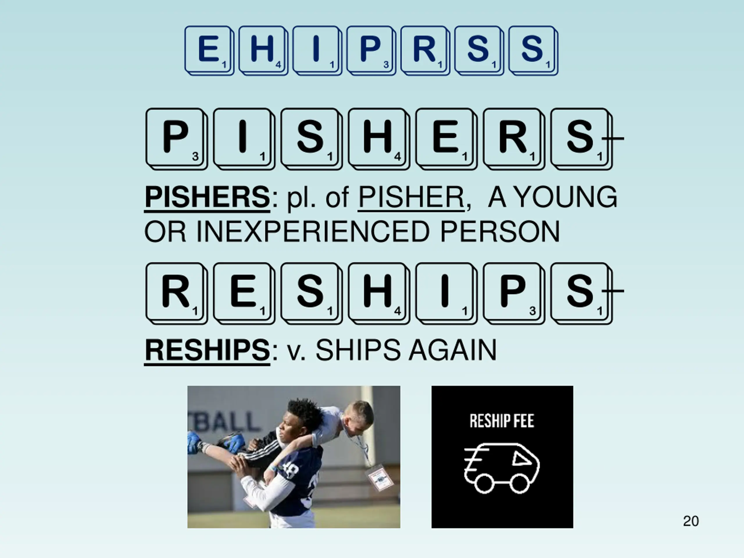 EHIPRSS _ PISHERS PISHERS: pl. of PISHER, A YOUNG OR INEXPERIENCED PERSON _ RESHIPS RESHIPS: v. SHIPS AGAIN 20