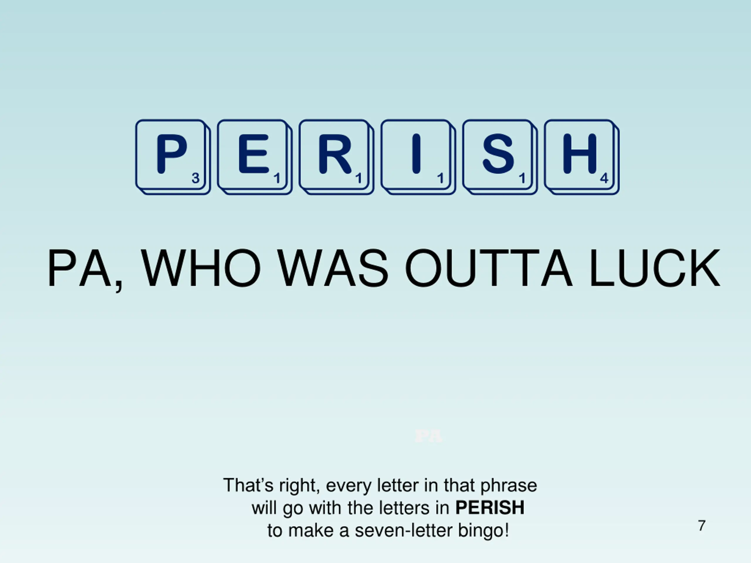 PERISH PA, WHO WAS OUTTA LUCK PA That s right, every letter in that phrase will go with the letters in PERISH to make a seven-letter bingo! 7