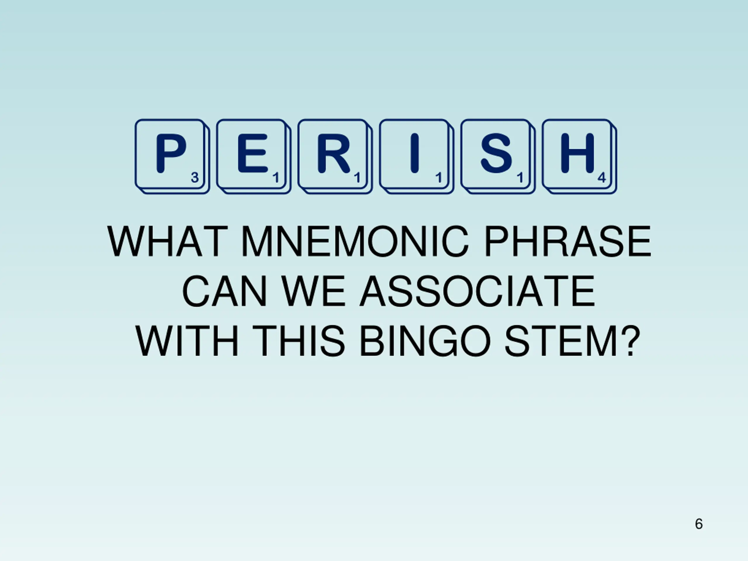 PERISH WHAT MNEMONIC PHRASE CAN WE ASSOCIATE WITH THIS BINGO STEM? 6