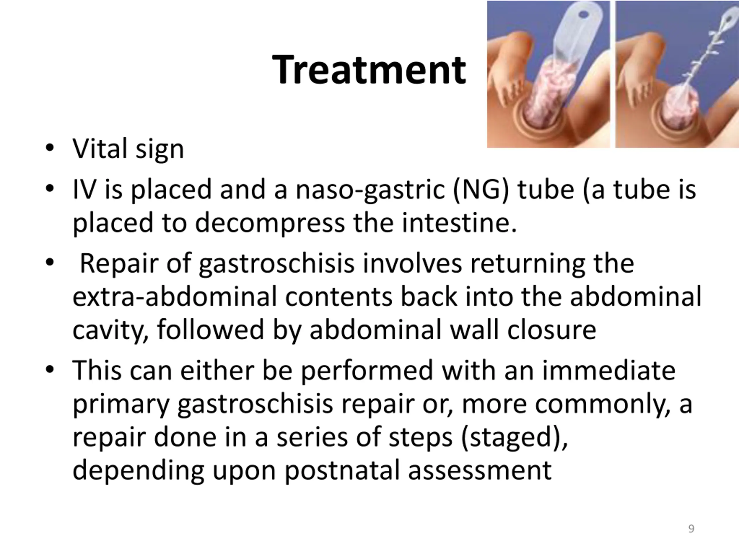 Treatment Vital sign IV is placed and a naso-gastric (NG) tube (a tube is placed to decompress the intestine. Repair of gastroschisis involves returning the extra-abdominal contents back into the abdominal cavity, followed by abdominal wall closure This can either be performed with an immediate primary gastroschisis repair or, more commonly, a repair done in a series of steps (staged), depending upon postnatal assessment 9