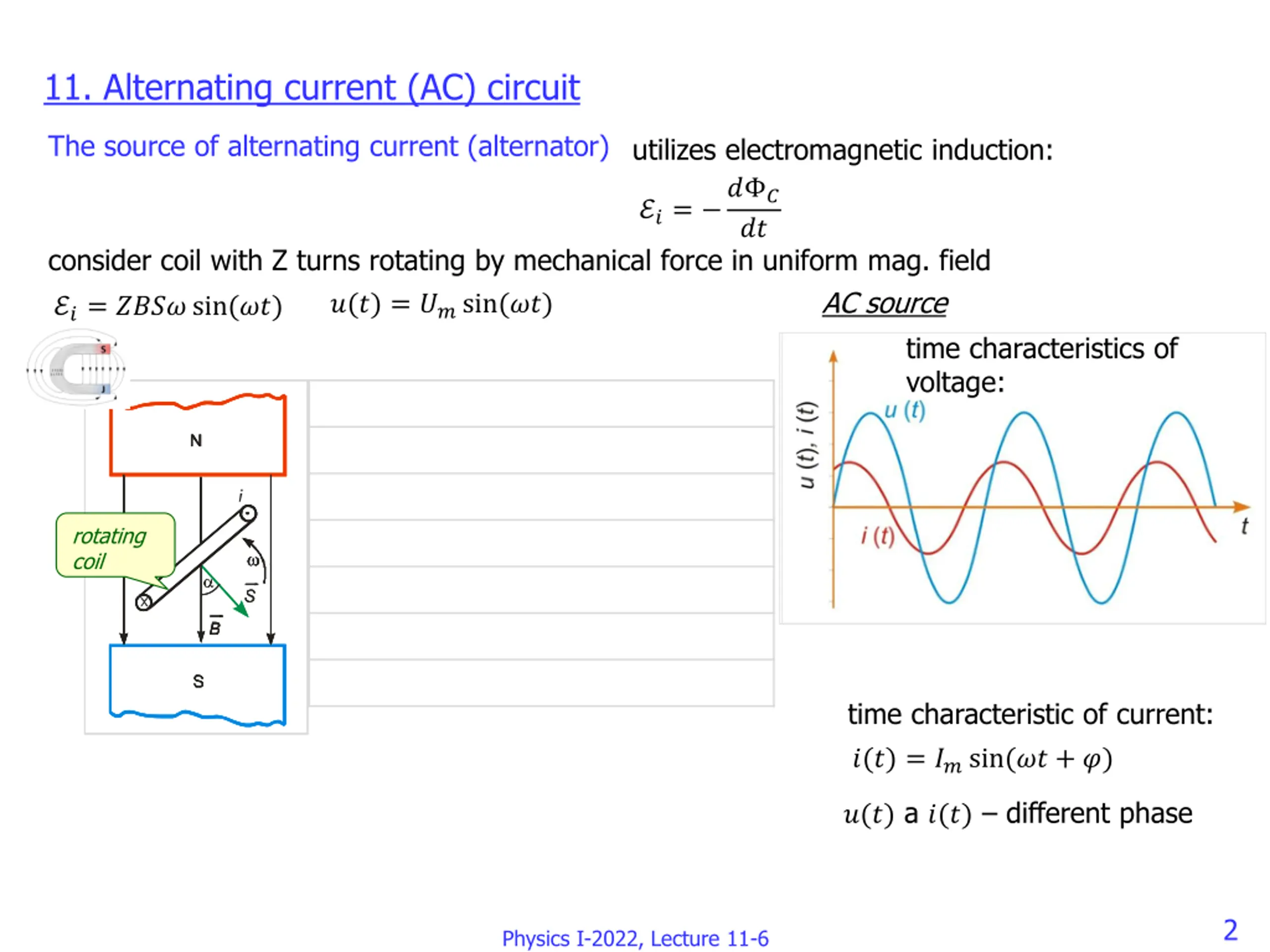 11. Alternating current (AC) circuit The source of alternating current (alternator) utilizes electromagnetic induction: ?= ? ? ?? consider coil with Z turns rotating by mechanical force in uniform mag. field AC source ?(?) = ??sin(??) ?= ???? sin(??) time characteristics of voltage: rotating coil time characteristic of current: ?(?) = ??sin(?? + ?) ?(?) a ?(?) different phase 2 Physics I-2022, Lecture 11-6