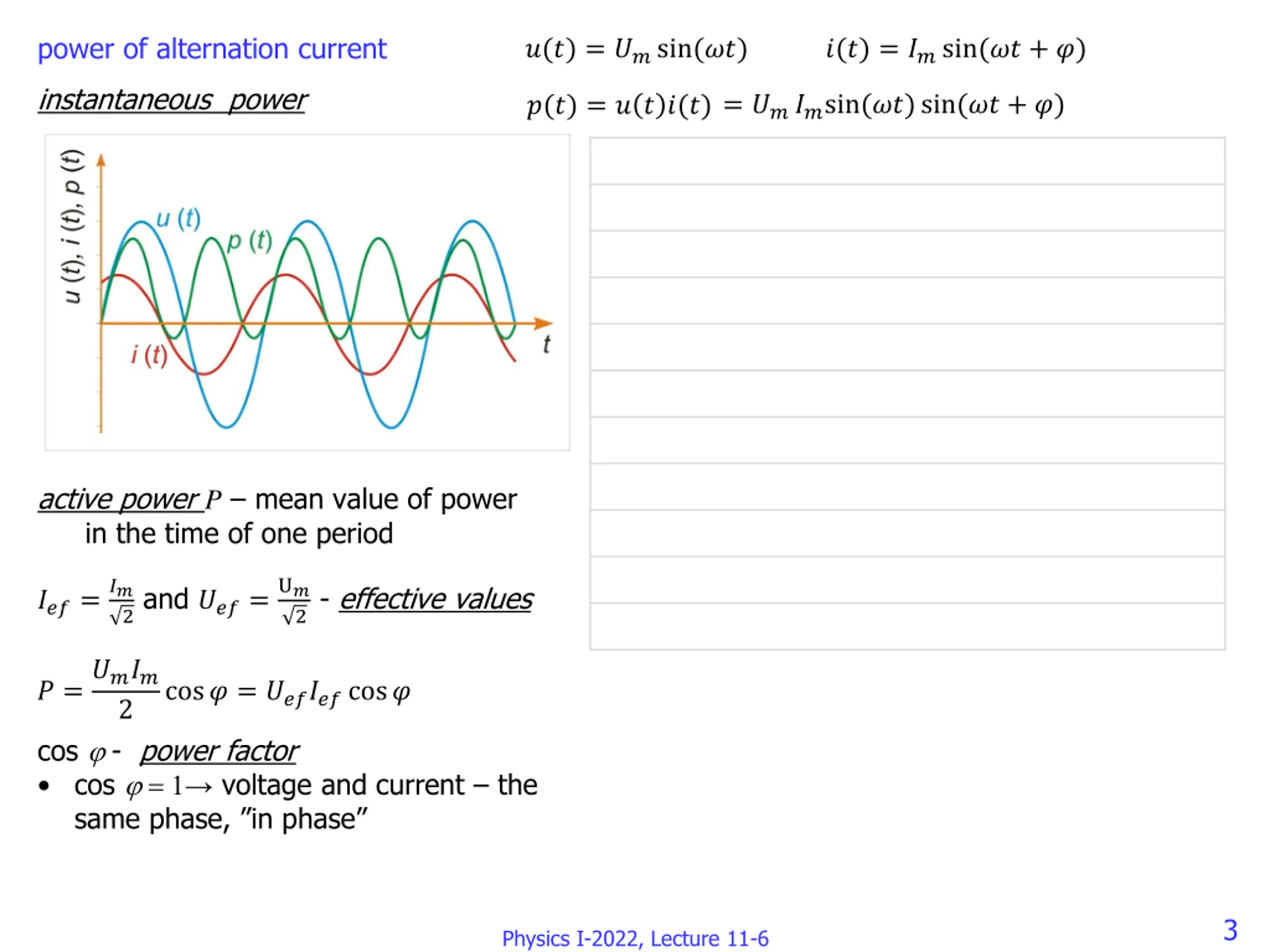 power of alternation current ?(?) = ??sin(?? + ?) ?(?) = ??sin(??) instantaneous power = ????sin(??)sin(?? + ?) ?(?) = ? ? ?(?) active power P mean value of power in the time of one period ???=?? 2 and ???=U? 2 - effective values ? =???? cos? = ??????cos? 2 cos - power factor cos = voltage and current the same phase, in phase 3 Physics I-2022, Lecture 11-6