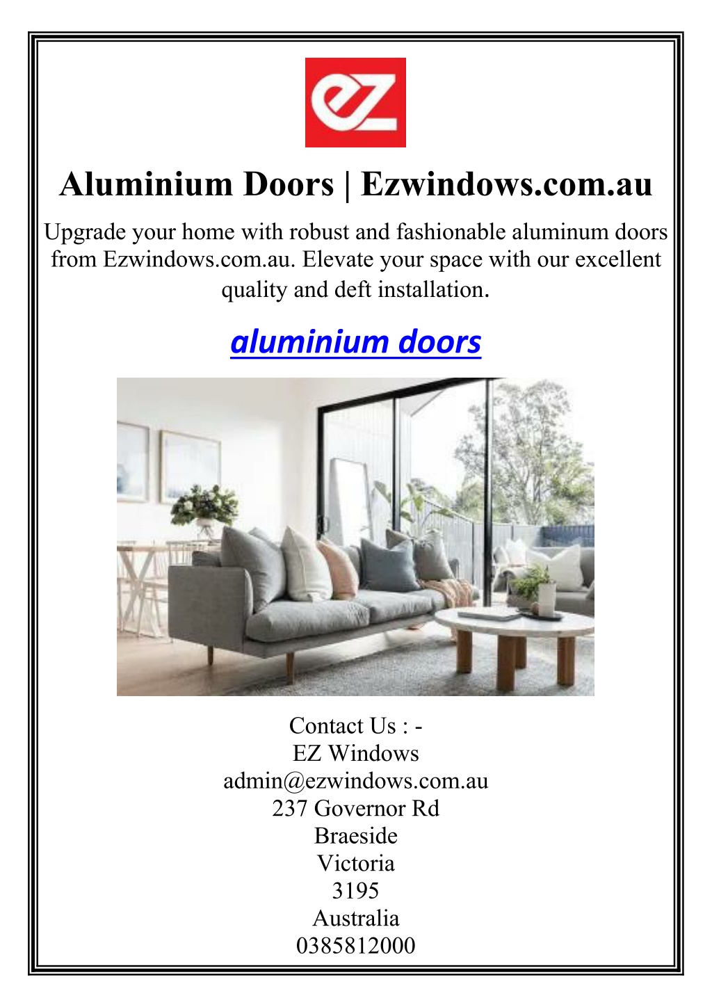Aluminium Doors | Ezwindows.com.au Upgrade your home with robust and fashionable aluminum doors from Ezwindows.com.au. Elevate your space with our excellent quality and deft installation. aluminium doors Contact Us : - EZ Windows admin@ezwindows.com.au 237 Governor Rd Braeside Victoria 3195 Australia 0385812000