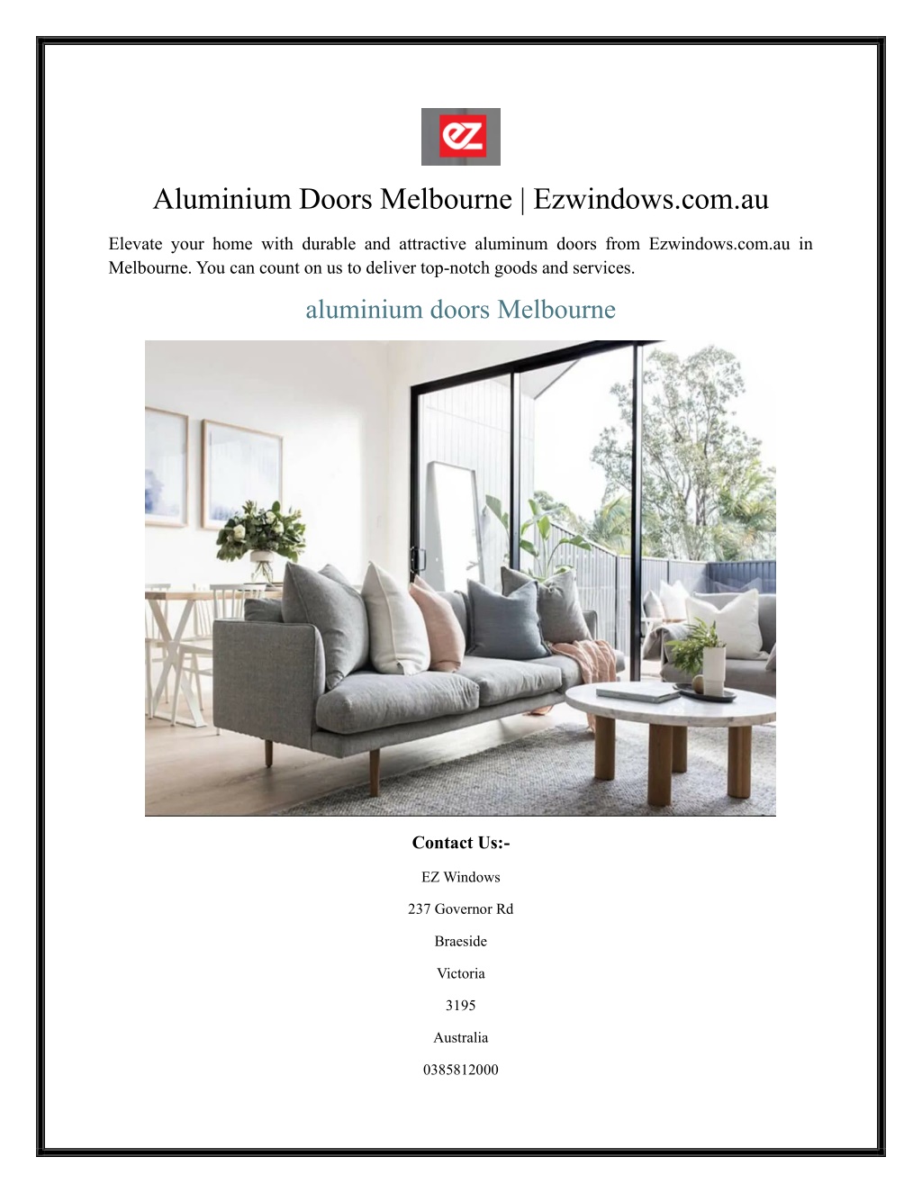 Aluminium Doors Melbourne | Ezwindows.com.au Elevate your home with durable and attractive aluminum doors from Ezwindows.com.au in Melbourne. You can count on us to deliver top-notch goods and services. aluminium doors Melbourne Contact Us:- EZ Windows 237 Governor Rd Braeside Victoria 3195 Australia 0385812000