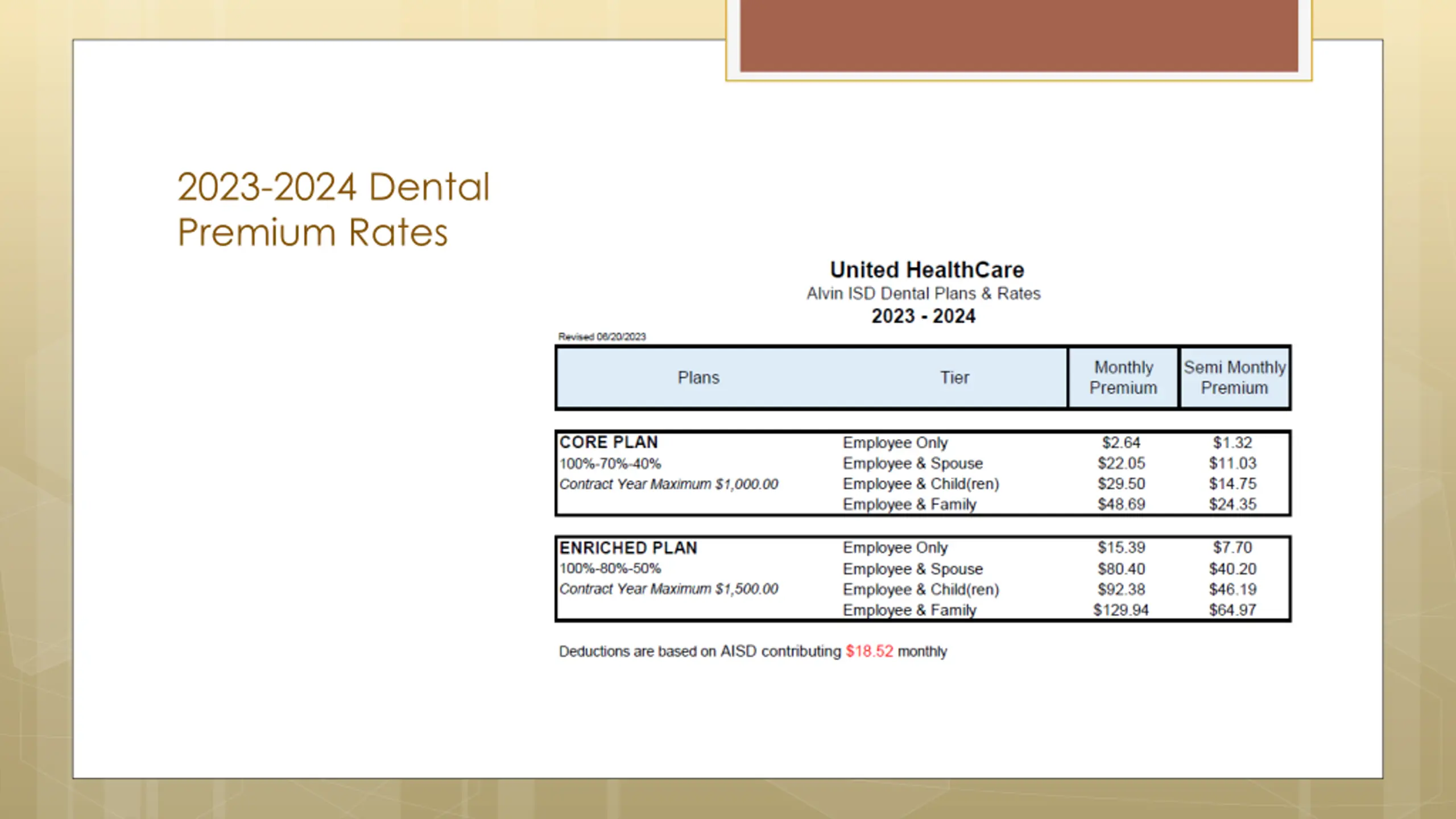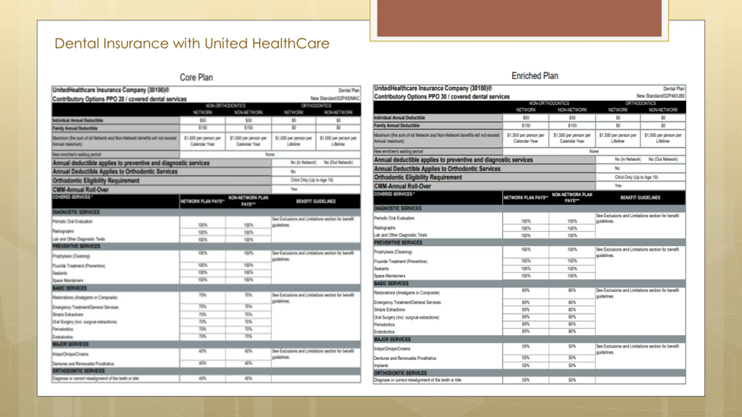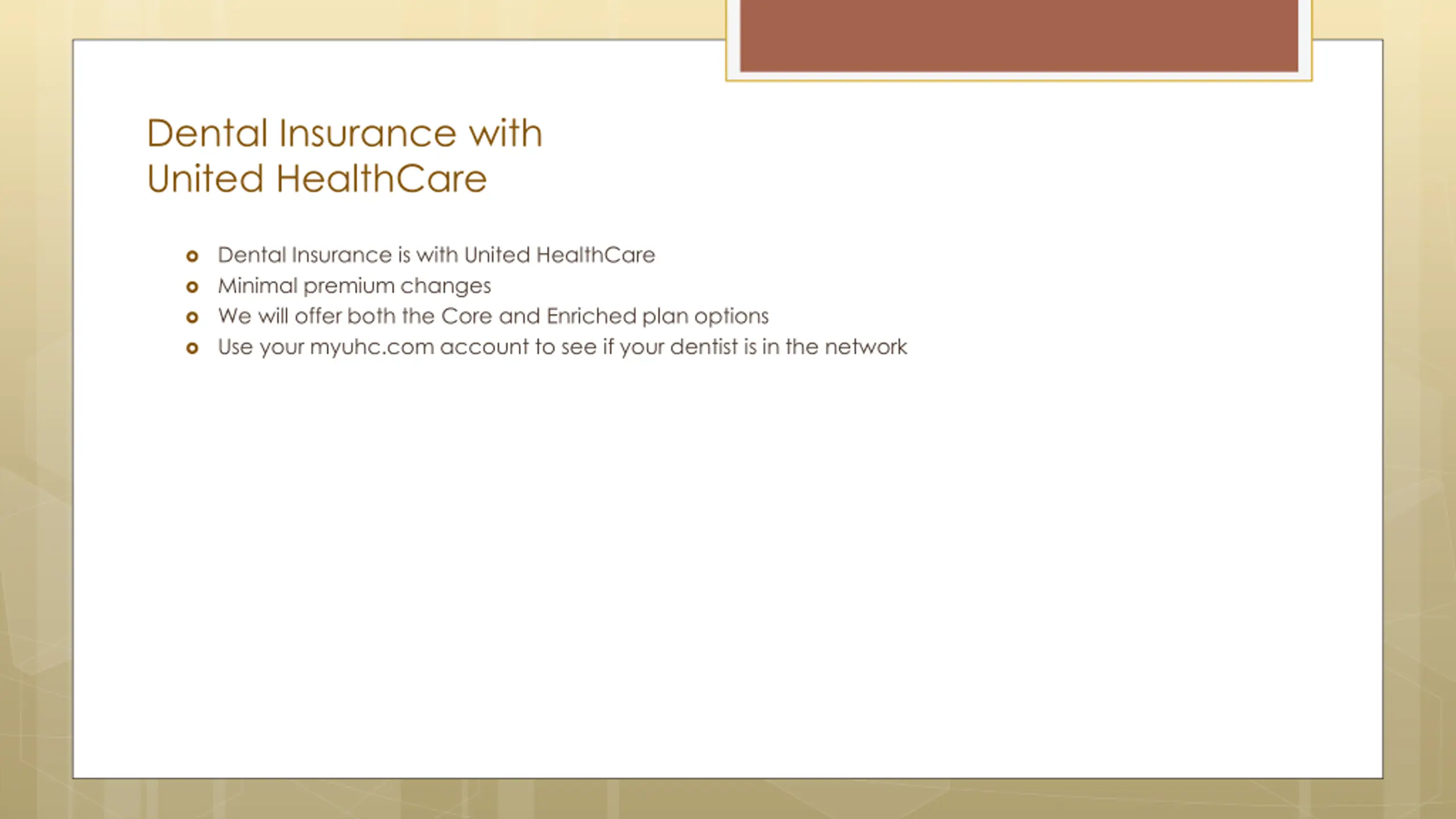 Dental Insurance with United HealthCare Dental Insurance is with United HealthCare Minimal premium changes We will offer both the Core and Enriched plan options Use your myuhc.com account to see if your dentist is in the network