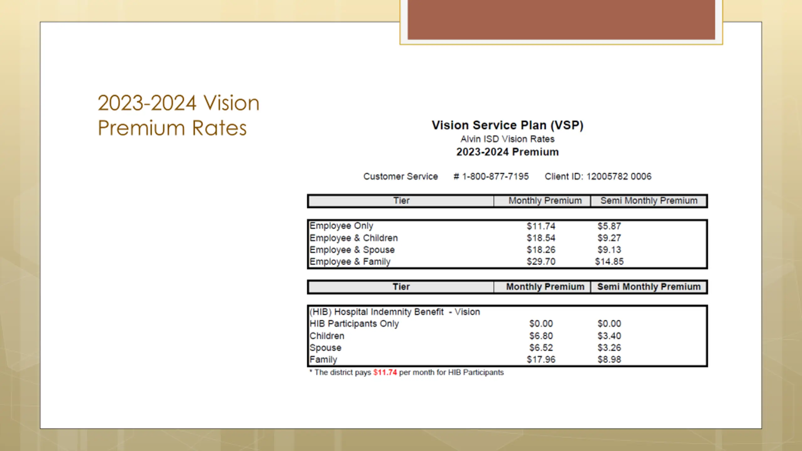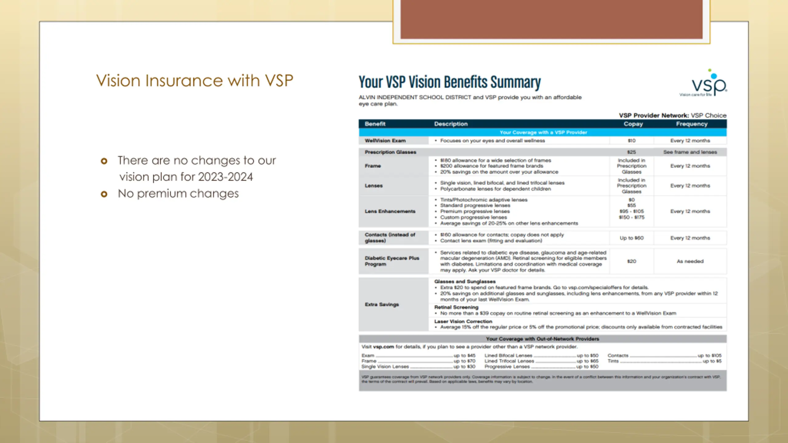 Vision Insurance with VSP There are no changes to our vision plan for 2023-2024 No premium changes