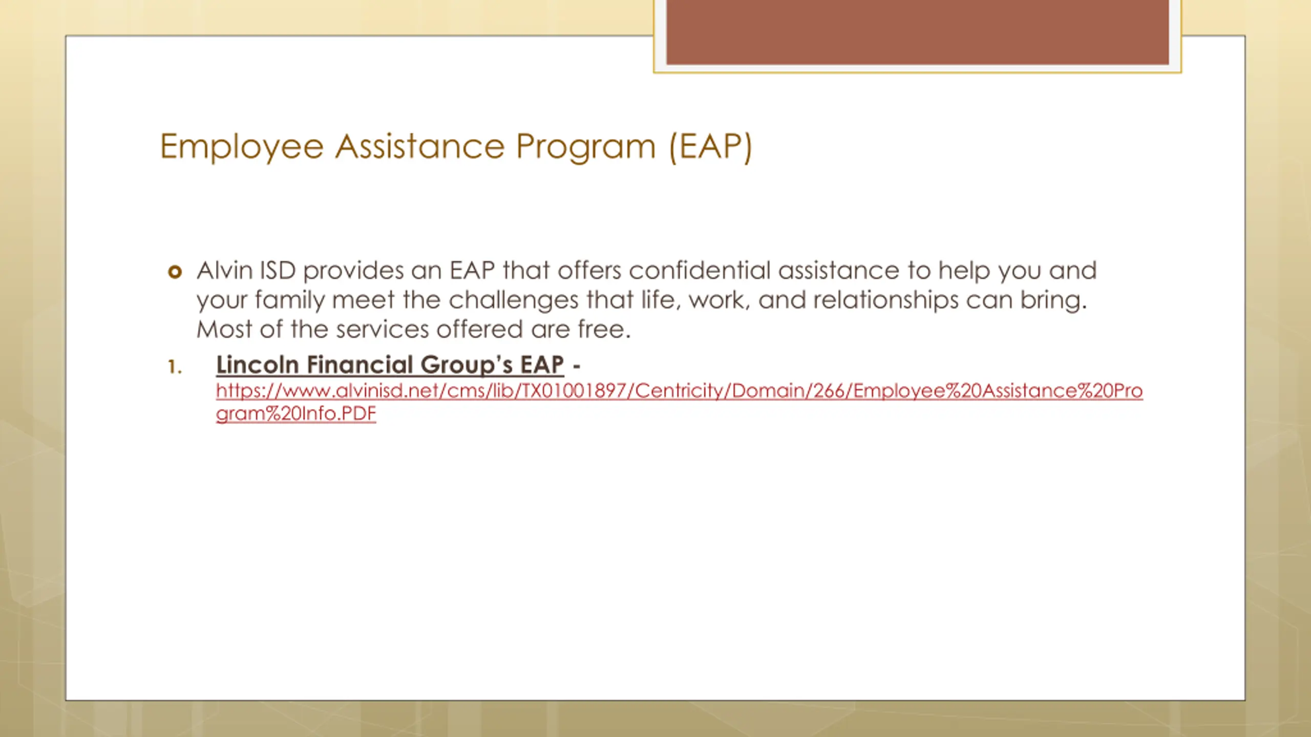 Employee Assistance Program (EAP) Alvin ISD provides an EAP that offers confidential assistance to help you and your family meet the challenges that life, work, and relationships can bring. Most of the services offered are free. Lincoln Financial Group s EAP - https://www.alvinisd.net/cms/lib/TX01001897/Centricity/Domain/266/Employee%20Assistance%20Pro gram%20Info.PDF 1.