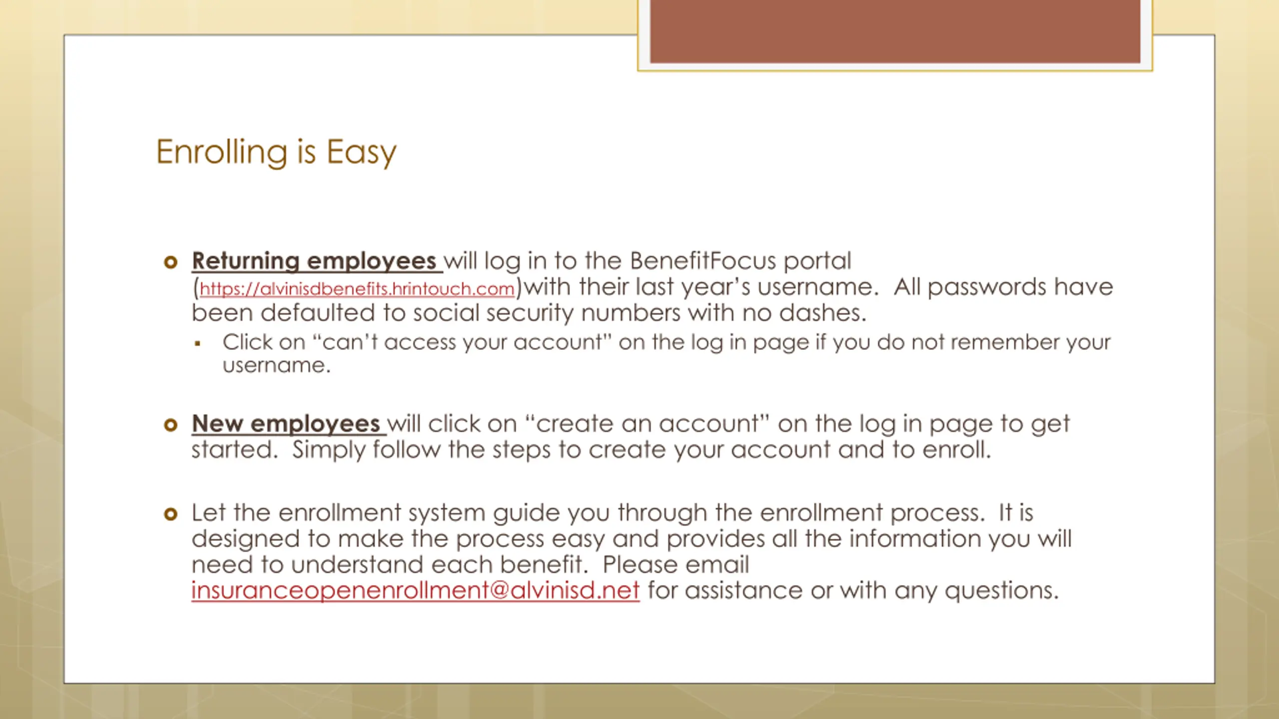 Enrolling is Easy Returning employees will log in to the BenefitFocus portal (https://alvinisdbenefits.hrintouch.com)with their last year s username. All passwords have been defaulted to social security numbers with no dashes. Click on can t access your account on the log in page if you do not remember your username. New employees will click on create an account on the log in page to get started. Simply follow the steps to create your account and to enroll. Let the enrollment system guide you through the enrollment process. It is designed to make the process easy and provides all the information you will need to understand each benefit. Please email insuranceopenenrollment@alvinisd.net for assistance or with any questions.