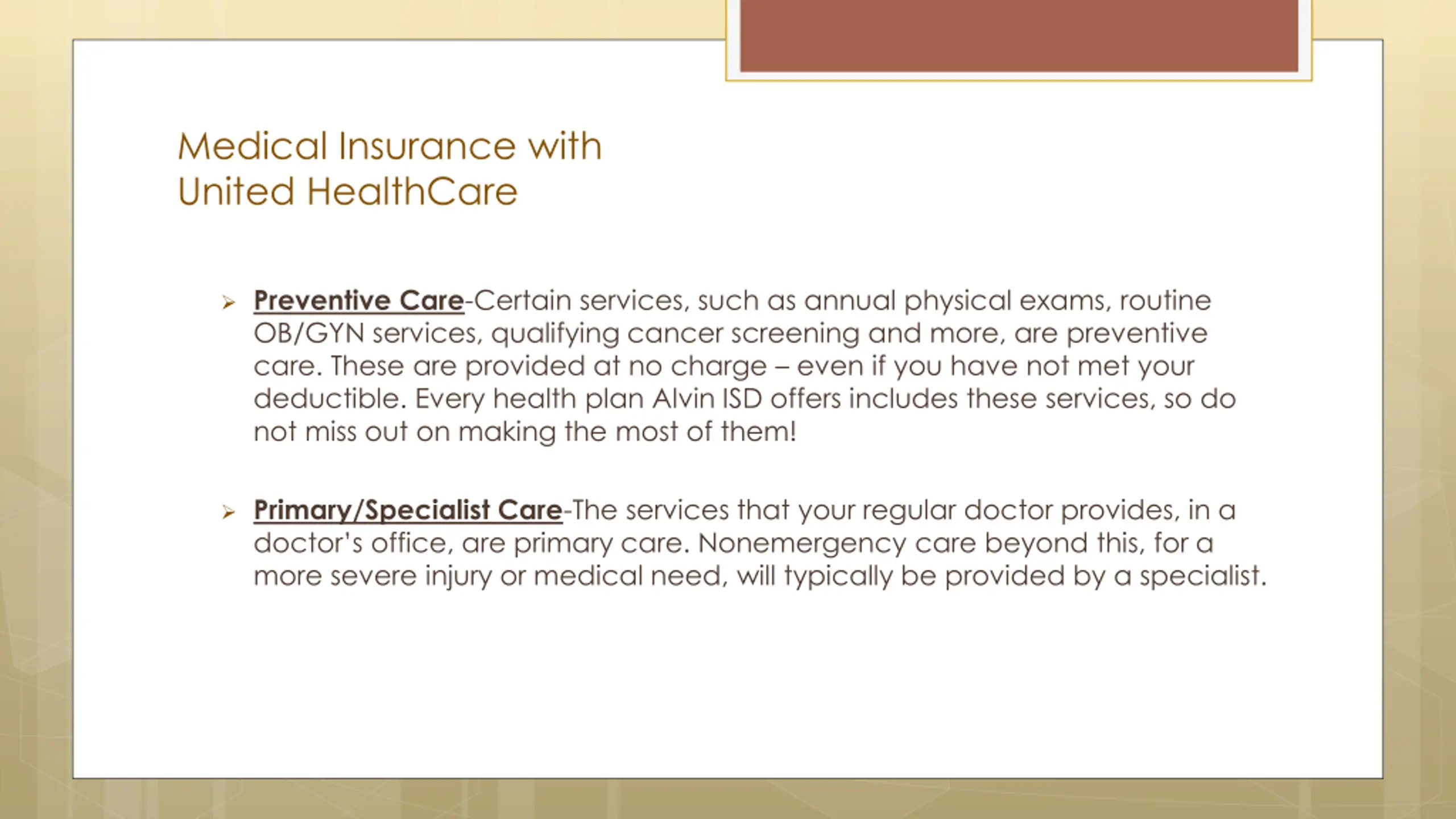 Medical Insurance with United HealthCare Preventive Care-Certain services, such as annual physical exams, routine OB/GYN services, qualifying cancer screening and more, are preventive care. These are provided at no charge even if you have not met your deductible. Every health plan Alvin ISD offers includes these services, so do not miss out on making the most of them! Primary/Specialist Care-The services that your regular doctor provides, in a doctor s office, are primary care. Nonemergency care beyond this, for a more severe injury or medical need, will typically be provided by a specialist.