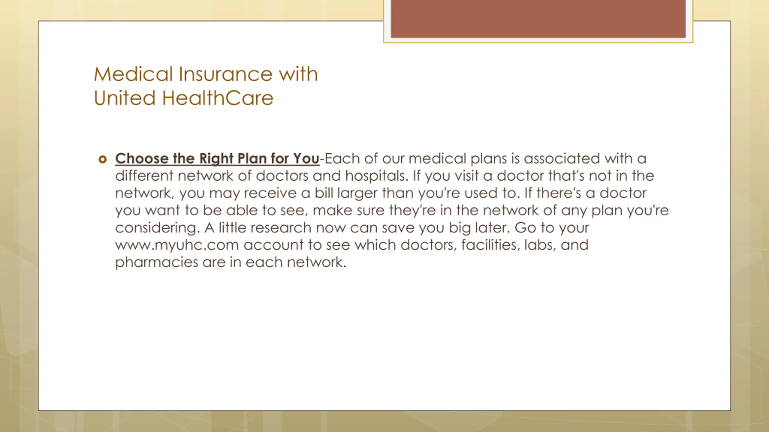 Medical Insurance with United HealthCare Choose the Right Plan for You-Each of our medical plans is associated with a different network of doctors and hospitals. If you visit a doctor that s not in the network, you may receive a bill larger than you re used to. If there s a doctor you want to be able to see, make sure they re in the network of any plan you're considering. A little research now can save you big later. Go to your www.myuhc.com account to see which doctors, facilities, labs, and pharmacies are in each network.