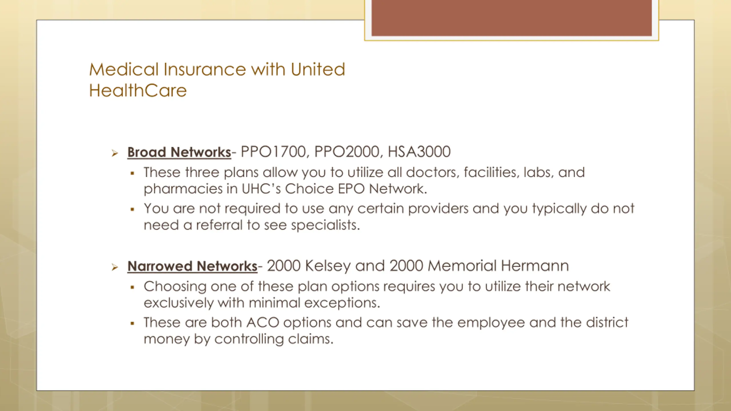 Medical Insurance with United HealthCare Broad Networks- PPO1700, PPO2000, HSA3000 These three plans allow you to utilize all doctors, facilities, labs, and pharmacies in UHC s Choice EPO Network. You are not required to use any certain providers and you typically do not need a referral to see specialists. Narrowed Networks- 2000 Kelsey and 2000 Memorial Hermann Choosing one of these plan options requires you to utilize their network exclusively with minimal exceptions. These are both ACO options and can save the employee and the district money by controlling claims.