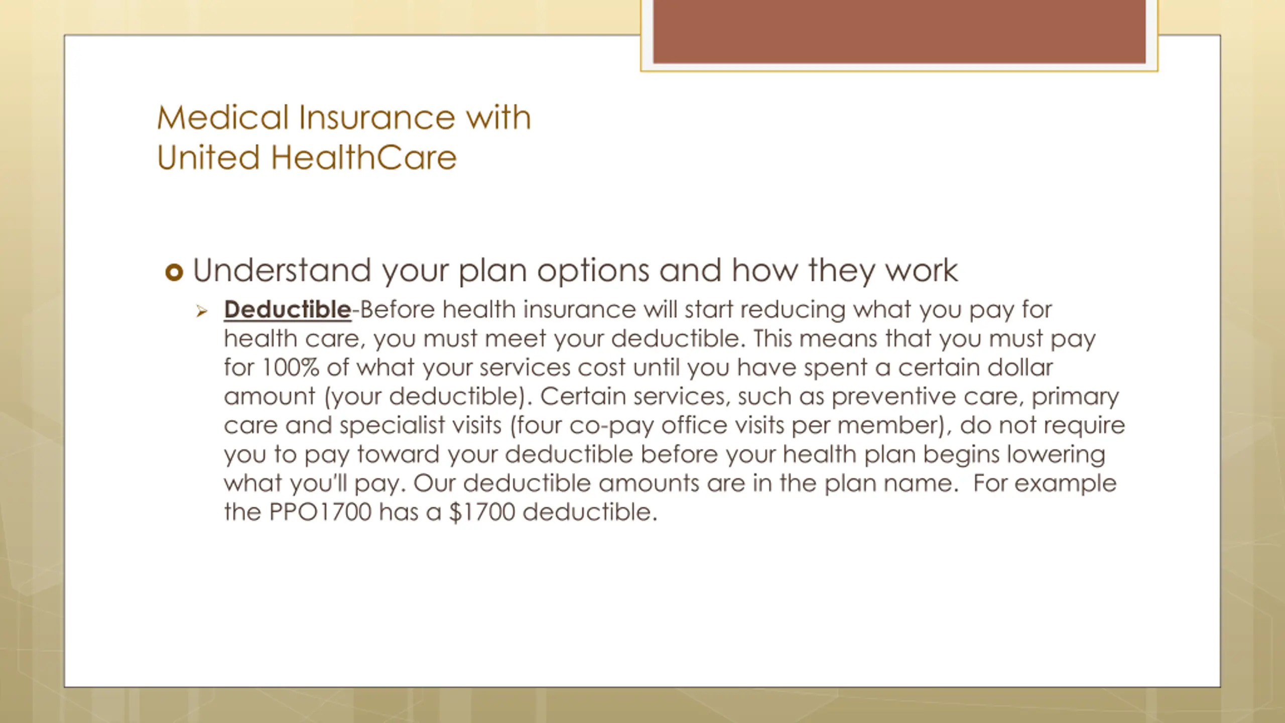 Medical Insurance with United HealthCare Understand your plan options and how they work Deductible-Before health insurance will start reducing what you pay for health care, you must meet your deductible. This means that you must pay for 100% of what your services cost until you have spent a certain dollar amount (your deductible). Certain services, such as preventive care, primary care and specialist visits (four co-pay office visits per member), do not require you to pay toward your deductible before your health plan begins lowering what you ll pay. Our deductible amounts are in the plan name. For example the PPO1700 has a $1700 deductible.