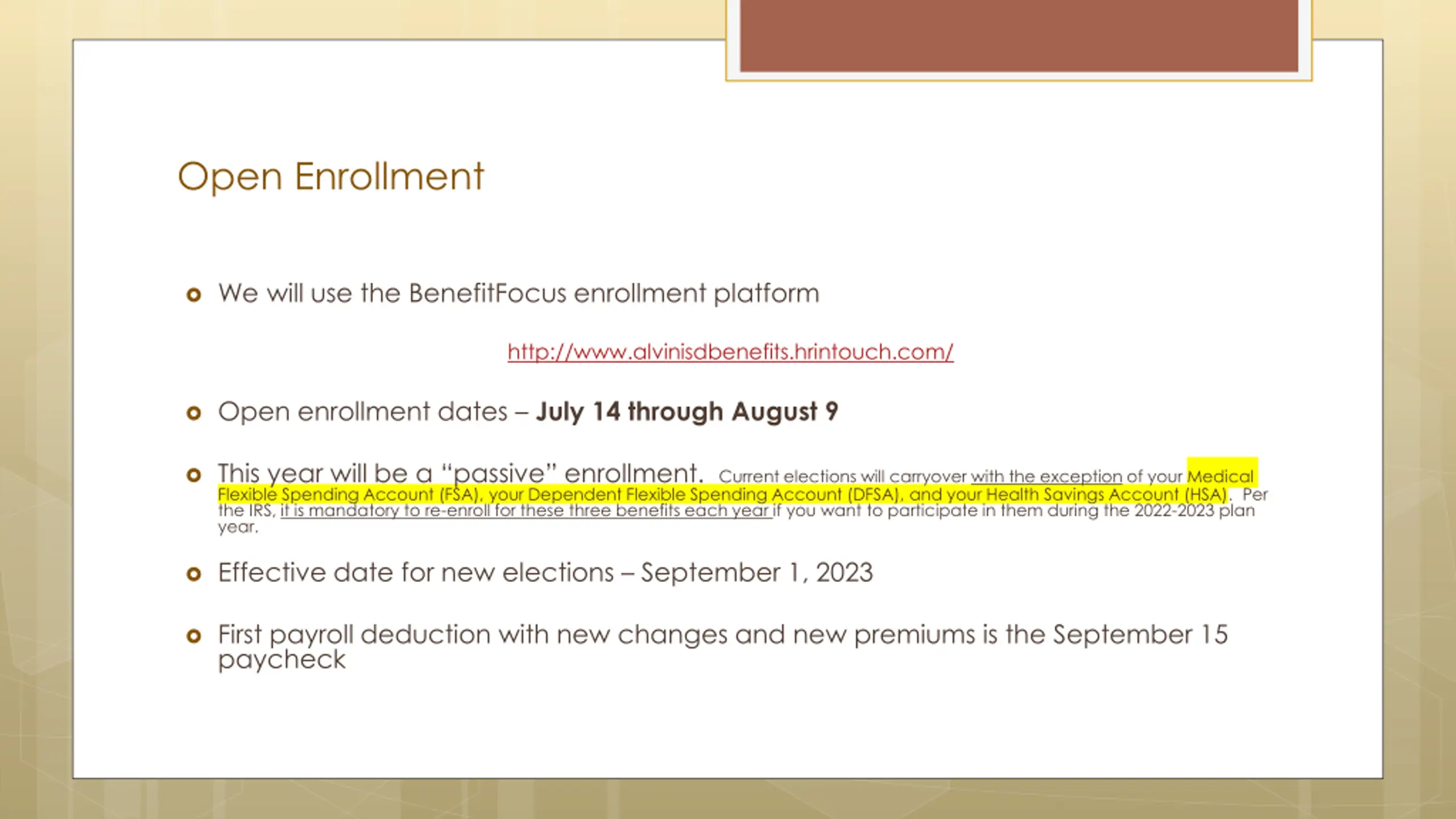 Open Enrollment We will use the BenefitFocus enrollment platform http://www.alvinisdbenefits.hrintouch.com/ Open enrollment dates July 14 through August 9 This year will be a passive enrollment. Current elections will carryover with the exception of your Medical Flexible Spending Account (FSA), your Dependent Flexible Spending Account (DFSA), and your Health Savings Account (HSA). Per the IRS, it is mandatory to re-enroll for these three benefits each year if you want to participate in them during the 2022-2023 plan year. Effective date for new elections September 1, 2023 First payroll deduction with new changes and new premiums is the September 15 paycheck