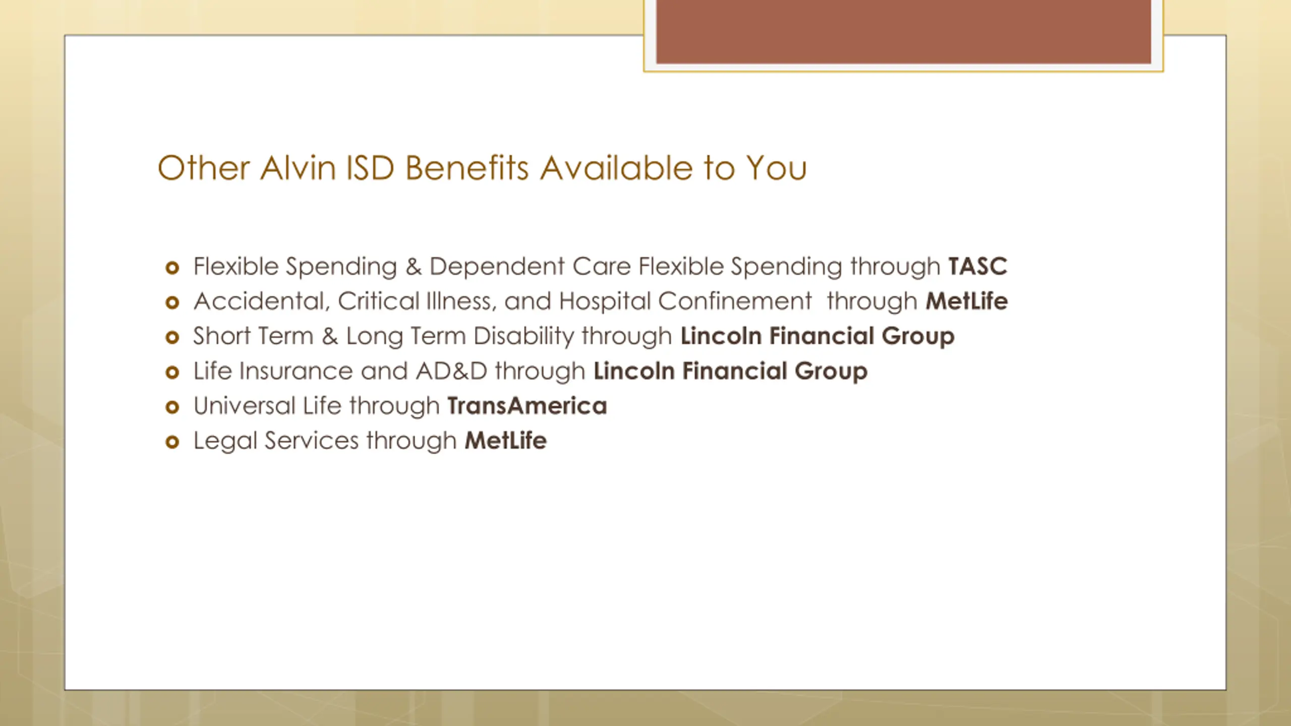 Other Alvin ISD Benefits Available to You Flexible Spending & Dependent Care Flexible Spending through TASC Accidental, Critical Illness, and Hospital Confinement through MetLife Short Term & Long Term Disability through Lincoln Financial Group Life Insurance and AD&D through Lincoln Financial Group Universal Life through TransAmerica Legal Services through MetLife