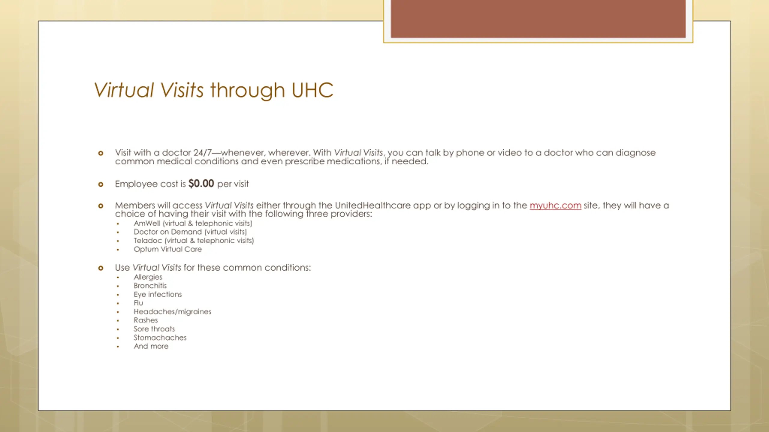 Virtual Visits through UHC Visit with a doctor 24/7 whenever, wherever. With Virtual Visits, you can talk by phone or video to a doctor who can diagnose common medical conditions and even prescribe medications, if needed. Employee cost is $0.00 per visit Members will access Virtual Visits either through the UnitedHealthcare app or by logging in to the myuhc.com site, they will have a choice of having their visit with the following three providers: AmWell (virtual & telephonic visits) Doctor on Demand (virtual visits) Teladoc (virtual & telephonic visits) Optum Virtual Care Use Virtual Visits for these common conditions: Allergies Bronchitis Eye infections Flu Headaches/migraines Rashes Sore throats Stomachaches And more