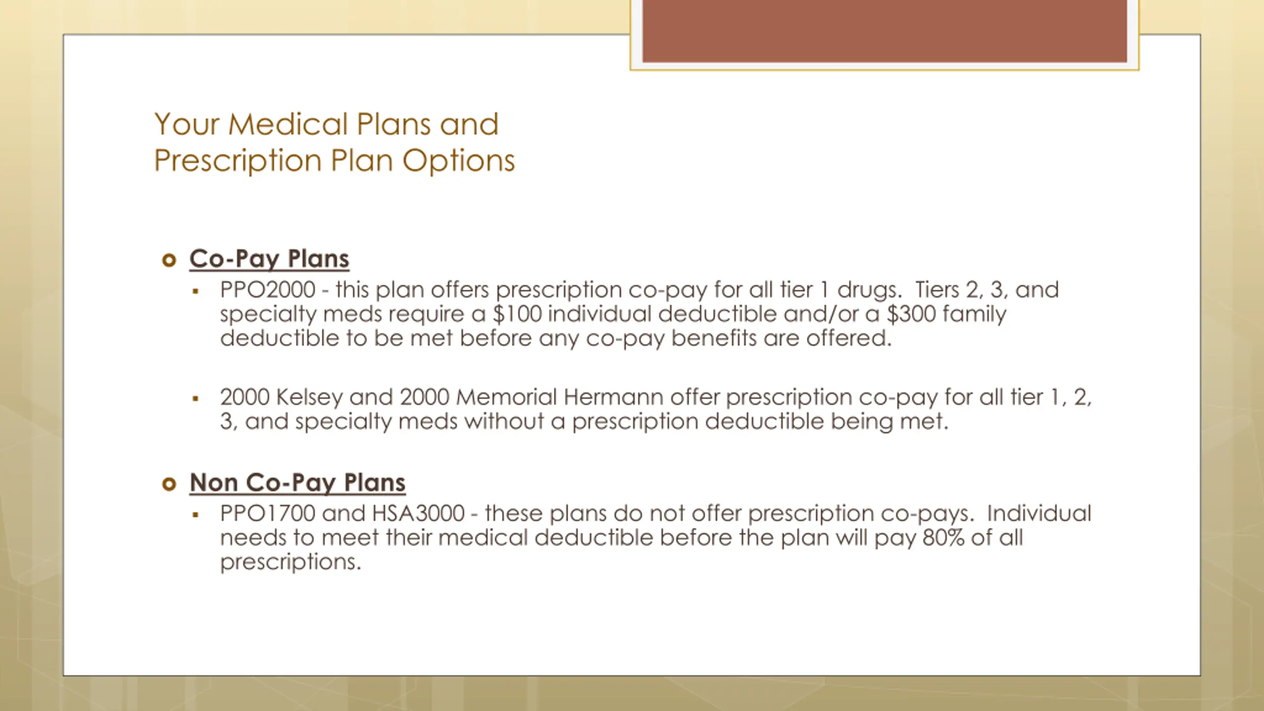 Your Medical Plans and Prescription Plan Options Co-Pay Plans PPO2000 - this plan offers prescription co-pay for all tier 1 drugs. Tiers 2, 3, and specialty meds require a $100 individual deductible and/or a $300 family deductible to be met before any co-pay benefits are offered. 2000 Kelsey and 2000 Memorial Hermann offer prescription co-pay for all tier 1, 2, 3, and specialty meds without a prescription deductible being met. Non Co-Pay Plans PPO1700 and HSA3000 - these plans do not offer prescription co-pays. Individual needs to meet their medical deductible before the plan will pay 80% of all prescriptions.