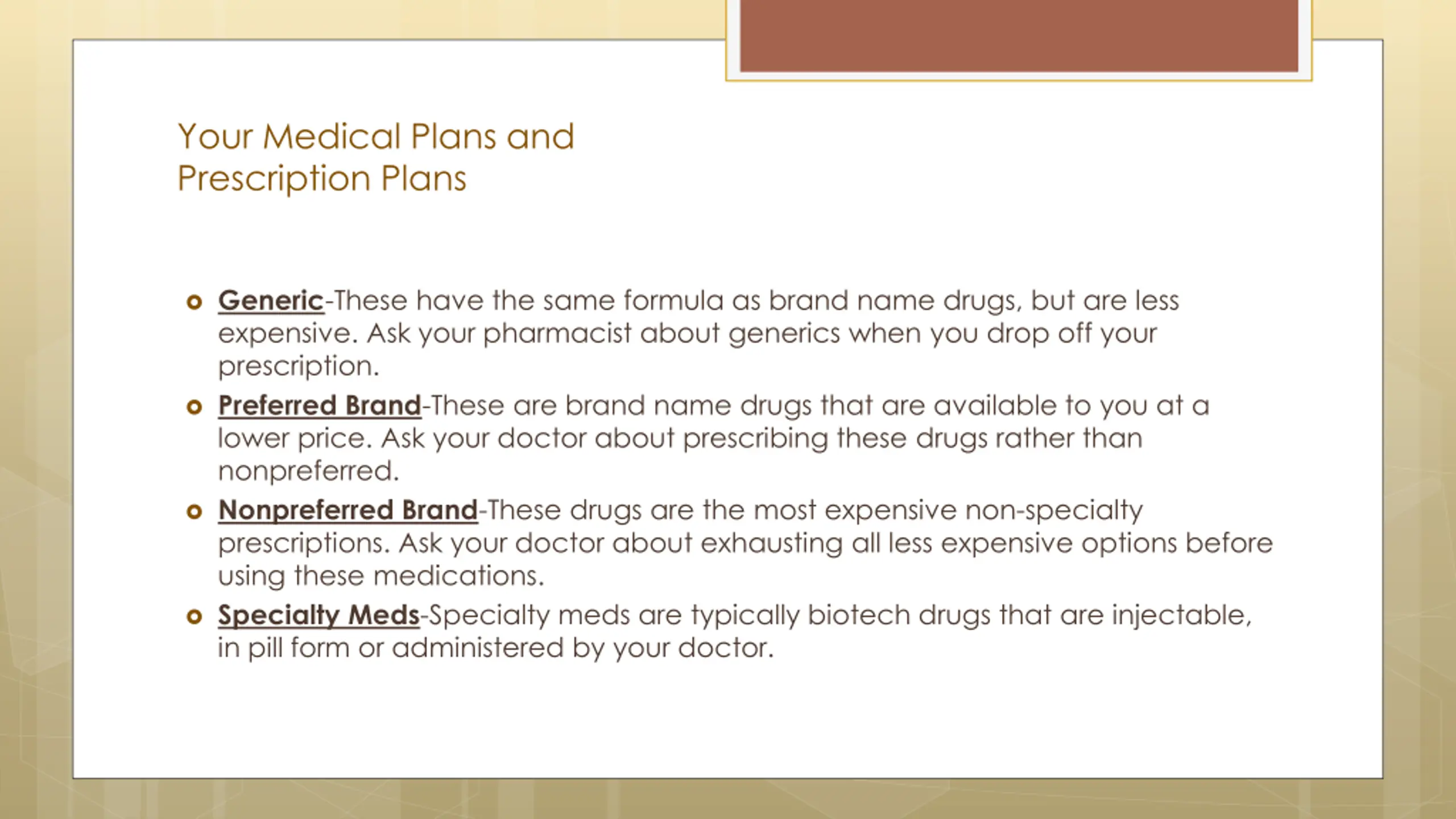 Your Medical Plans and Prescription Plans Generic-These have the same formula as brand name drugs, but are less expensive. Ask your pharmacist about generics when you drop off your prescription. Preferred Brand-These are brand name drugs that are available to you at a lower price. Ask your doctor about prescribing these drugs rather than nonpreferred. Nonpreferred Brand-These drugs are the most expensive non-specialty prescriptions. Ask your doctor about exhausting all less expensive options before using these medications. Specialty Meds-Specialty meds are typically biotech drugs that are injectable, in pill form or administered by your doctor.