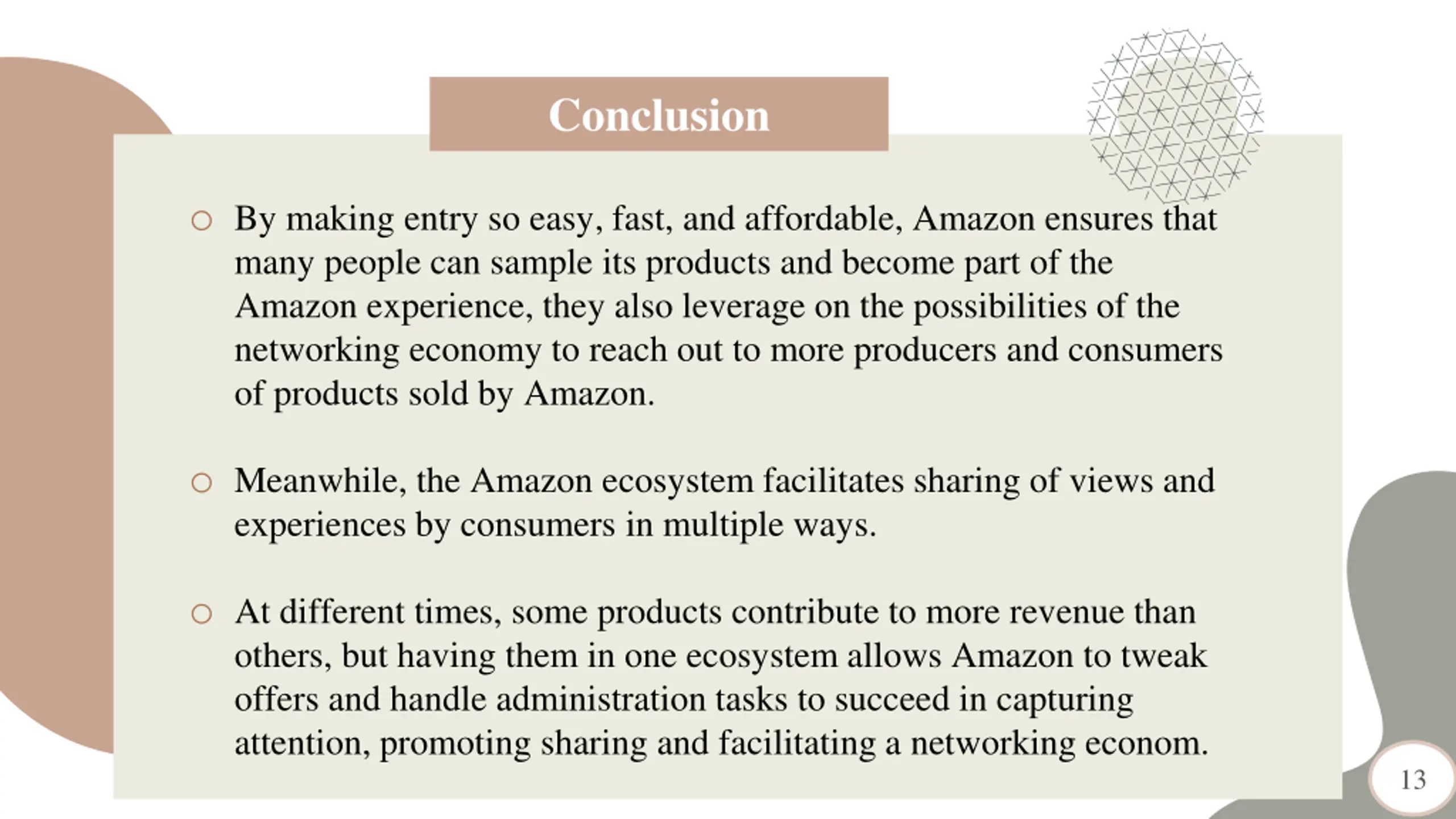 Conclusion o By making entry so easy, fast, and affordable, Amazon ensures that many people can sample its products and become part of the Amazon experience, they also leverage on the possibilities of the networking economy to reach out to more producers and consumers of products sold by Amazon. o Meanwhile, the Amazon ecosystem facilitates sharing of views and experiences by consumers in multiple ways. o At different times, some products contribute to more revenue than others, but having them in one ecosystem allows Amazon to tweak offers and handle administration tasks to succeed in capturing attention, promoting sharing and facilitating a networking econom. 13