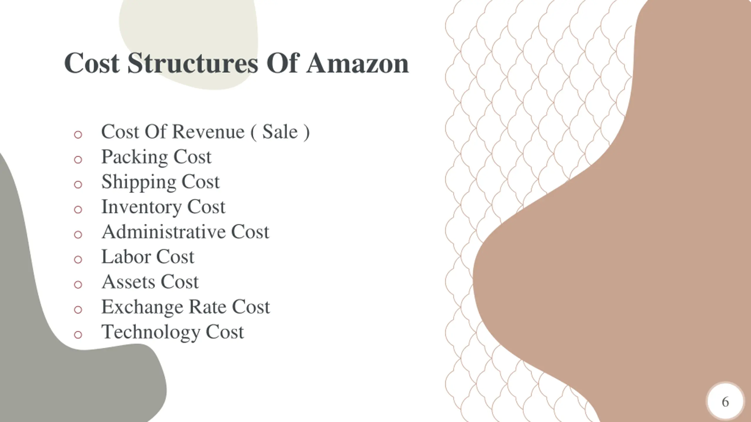 Cost Structures Of Amazon o Cost Of Revenue ( Sale ) o Packing Cost o Shipping Cost o Inventory Cost o Administrative Cost o Labor Cost o Assets Cost o Exchange Rate Cost o Technology Cost 6