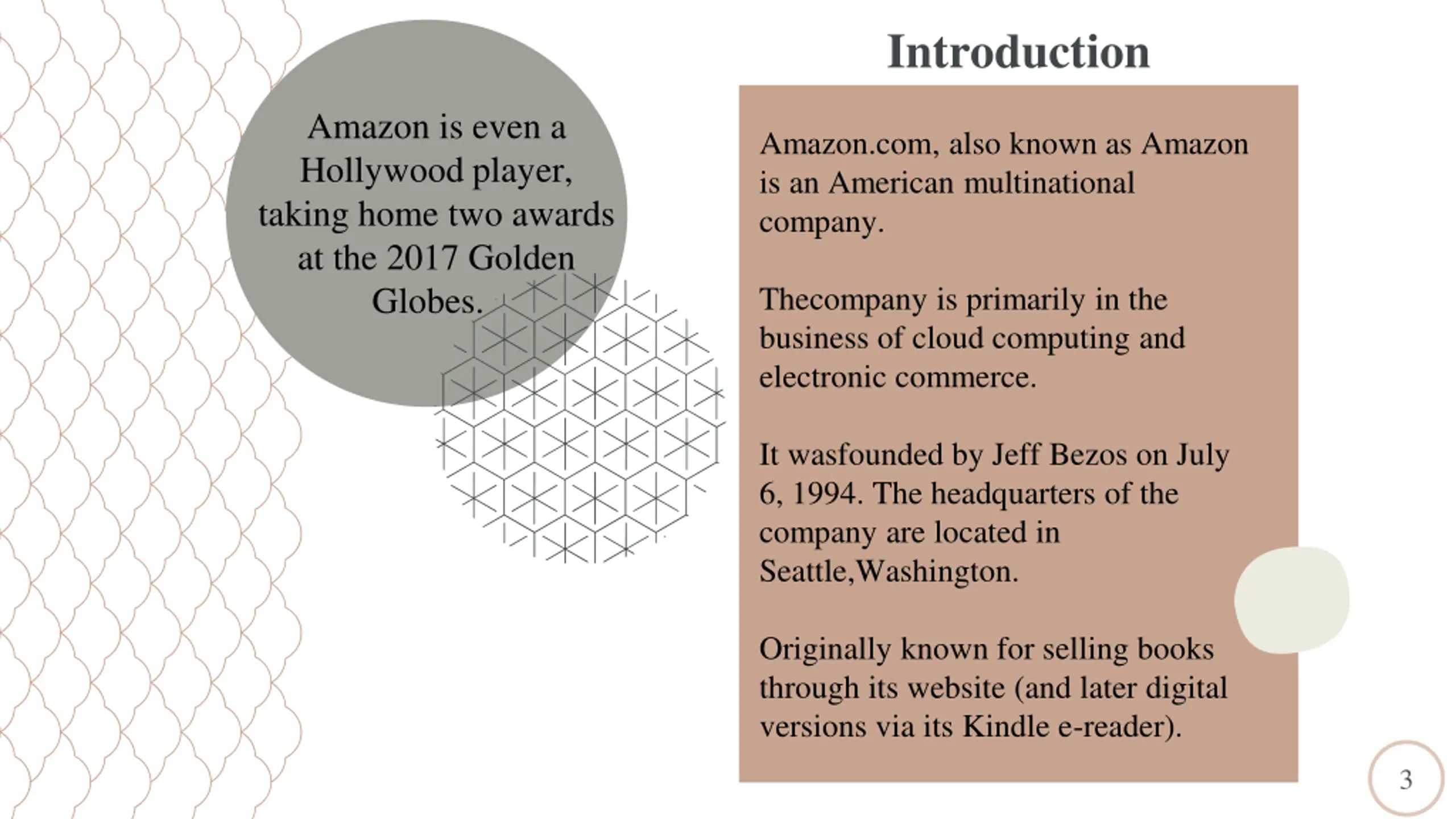Introduction Amazon is even a Hollywood player, taking home two awards at the 2017 Golden Globes. Amazon.com, also known as Amazon is an American multinational company. Thecompany is primarily in the business of cloud computing and electronic commerce. It wasfounded by Jeff Bezos on July 6, 1994. The headquarters of the company are located in Seattle,Washington. Originally known for selling books through its website (and later digital versions via its Kindle e-reader). 3