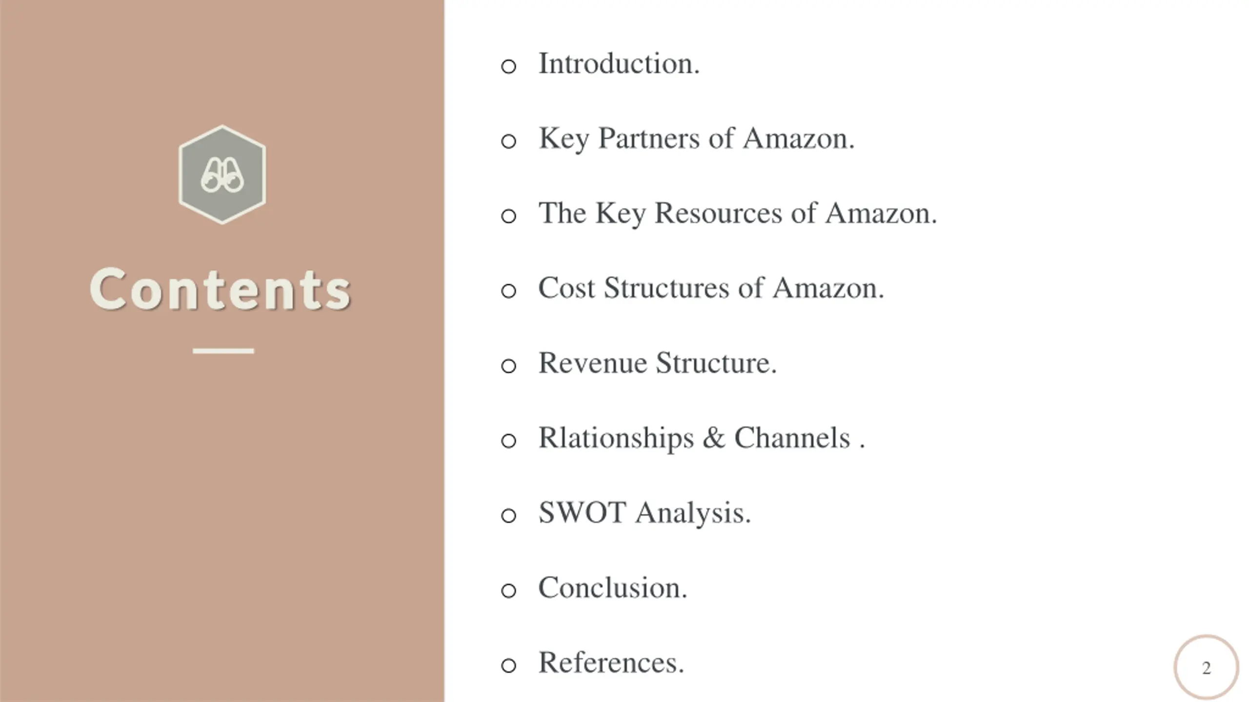 o Introduction. o Key Partners of Amazon. o The Key Resources of Amazon. Contents Contents o Cost Structures of Amazon. o Revenue Structure. o Rlationships & Channels . o SWOT Analysis. o Conclusion. o References. 2