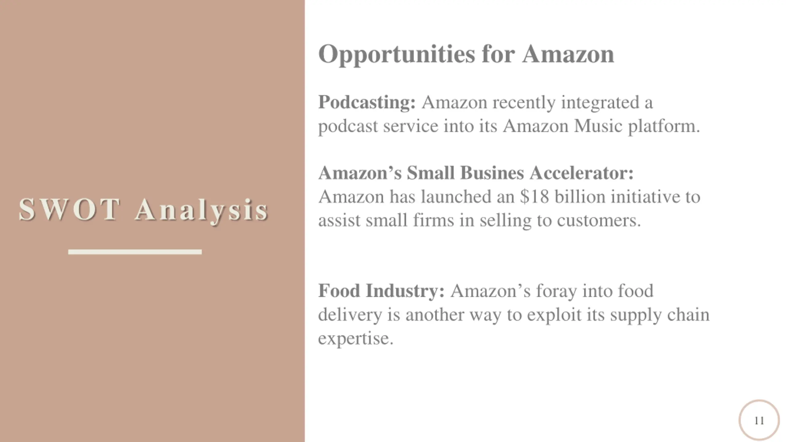 Opportunities for Amazon Podcasting: Amazon recently integrated a podcast service into its Amazon Music platform. Amazon s Small Busines Accelerator: Amazon has launched an $18 billion initiative to assist small firms in selling to customers. SWOT Analysis Food Industry: Amazon s foray into food delivery is another way to exploit its supply chain expertise. 11