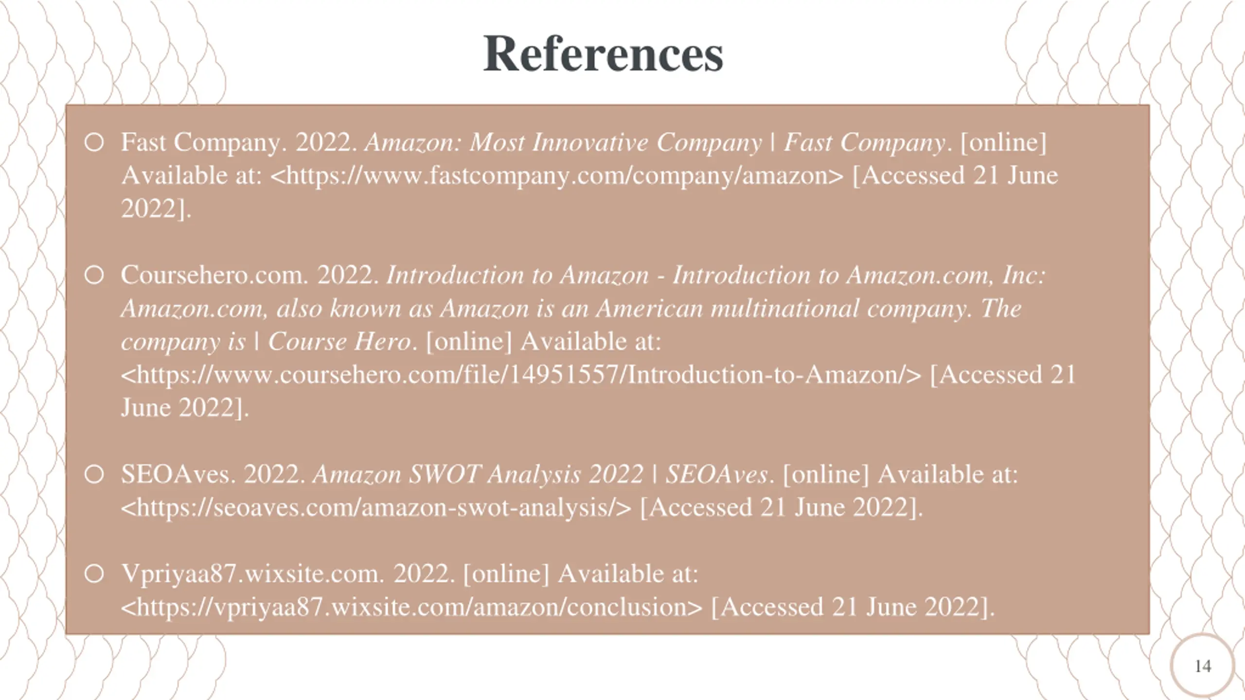 References o Fast Company. 2022. Amazon: Most Innovative Company | Fast Company. [online] Available at: <https://www.fastcompany.com/company/amazon> [Accessed 21 June 2022]. o Coursehero.com. 2022. Introduction to Amazon - Introduction to Amazon.com, Inc: Amazon.com, also known as Amazon is an American multinational company. The company is | Course Hero. [online] Available at: <https://www.coursehero.com/file/14951557/Introduction-to-Amazon/> [Accessed 21 June 2022]. o SEOAves. 2022. Amazon SWOT Analysis 2022 | SEOAves. [online] Available at: <https://seoaves.com/amazon-swot-analysis/> [Accessed 21 June 2022]. o Vpriyaa87.wixsite.com. 2022. [online] Available at: <https://vpriyaa87.wixsite.com/amazon/conclusion> [Accessed 21 June 2022]. 14