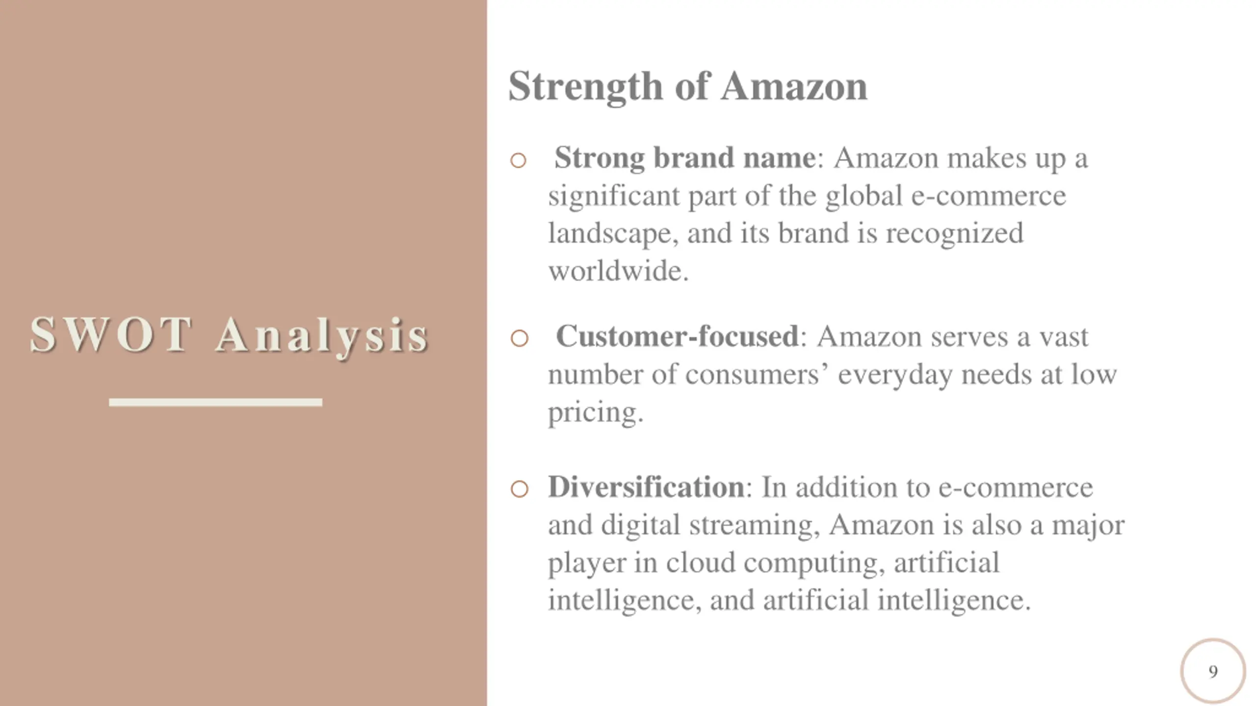 Strength of Amazon o Strong brand name: Amazon makes up a significant part of the global e-commerce landscape, and its brand is recognized worldwide. SWOT Analysis o Customer-focused: Amazon serves a vast number of consumers everyday needs at low pricing. o Diversification: In addition to e-commerce and digital streaming, Amazon is also a major player in cloud computing, artificial intelligence, and artificial intelligence. 9