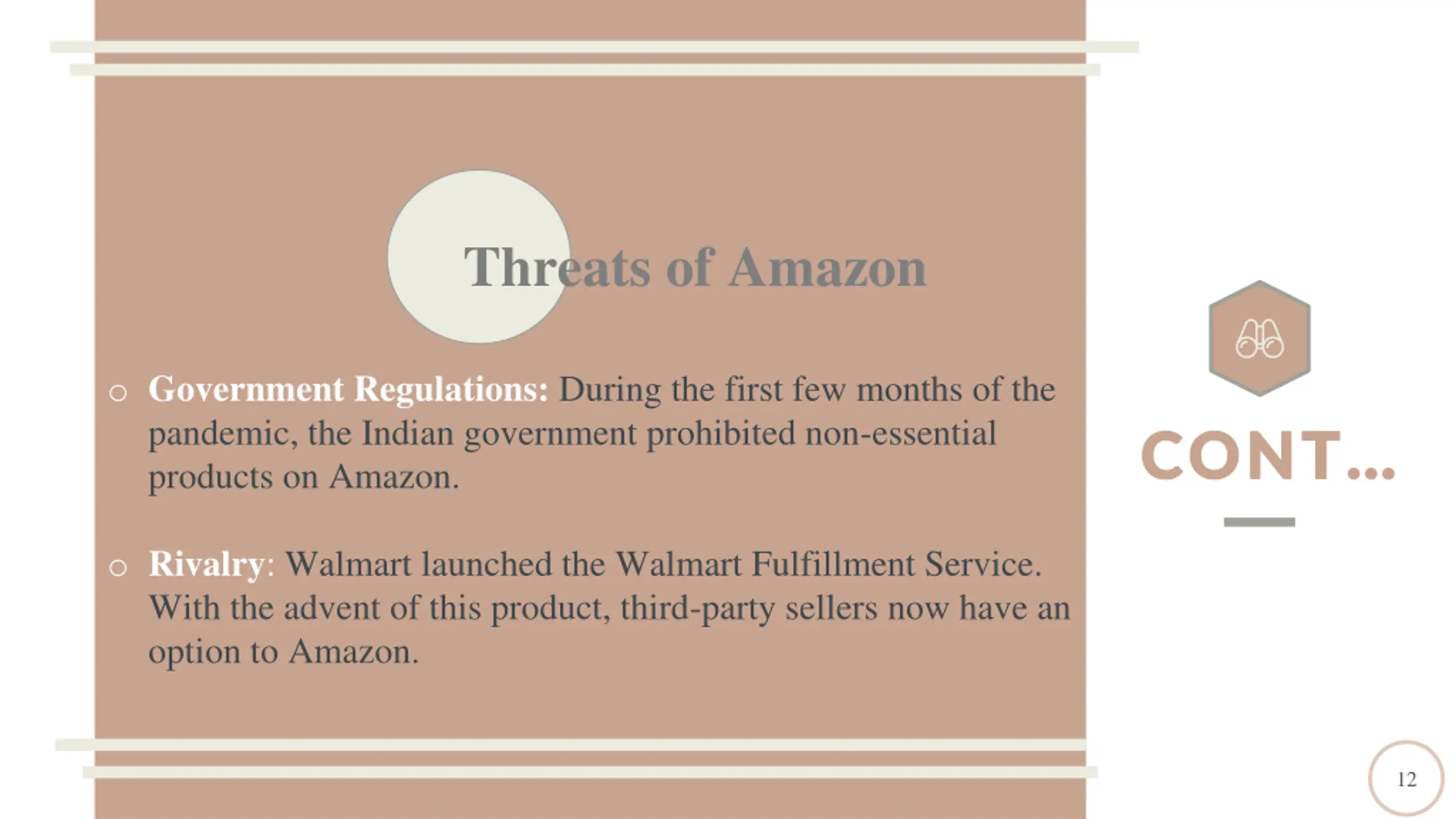 Threats of Amazon o Government Regulations: During the first few months of the pandemic, the Indian government prohibited non-essential products on Amazon. CONT CONT o Rivalry: Walmart launched the Walmart Fulfillment Service. With the advent of this product, third-party sellers now have an option to Amazon. 12