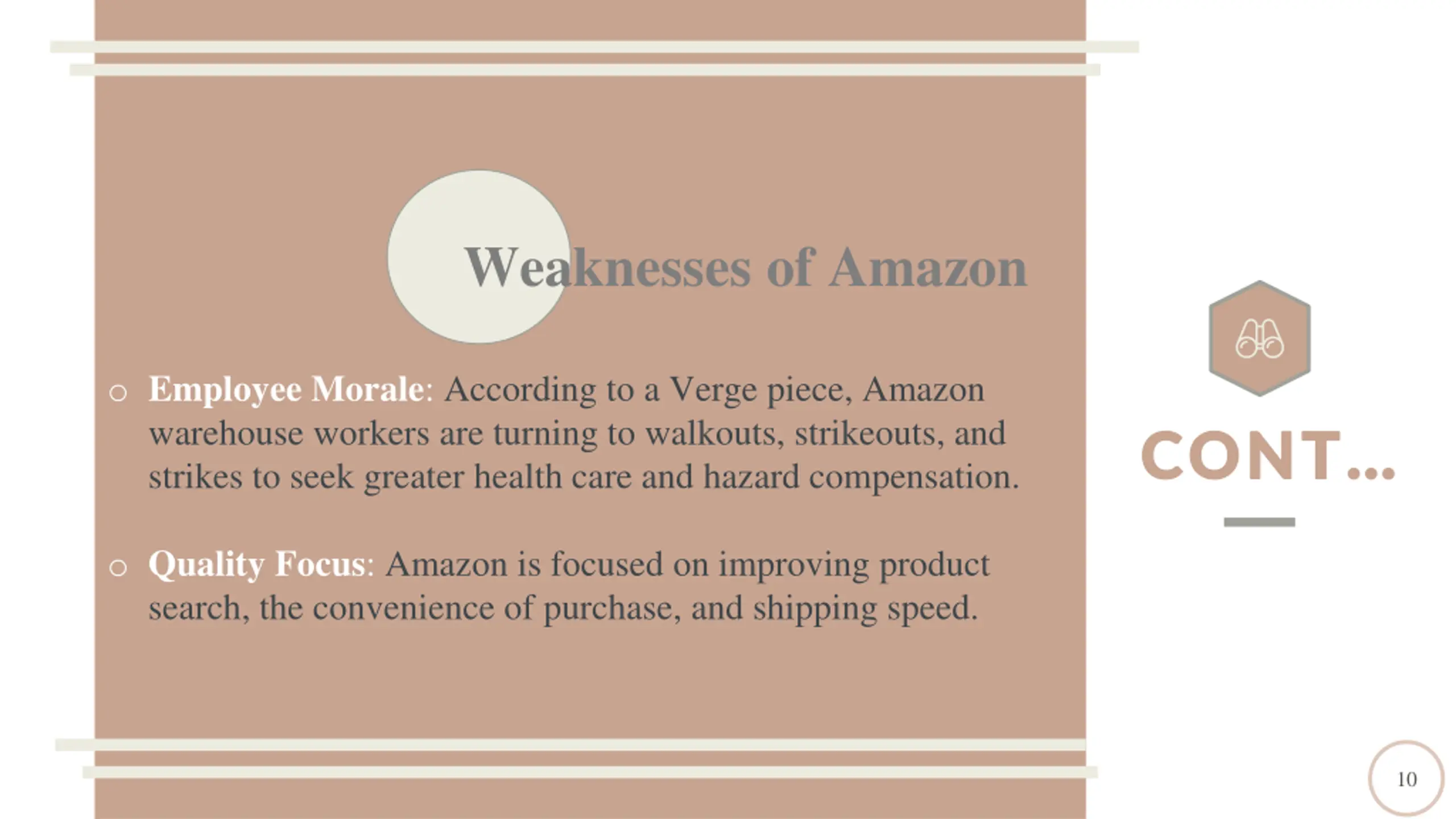 Weaknesses of Amazon o Employee Morale: According to a Verge piece, Amazon warehouse workers are turning to walkouts, strikeouts, and strikes to seek greater health care and hazard compensation. CONT CONT o Quality Focus: Amazon is focused on improving product search, the convenience of purchase, and shipping speed. 10