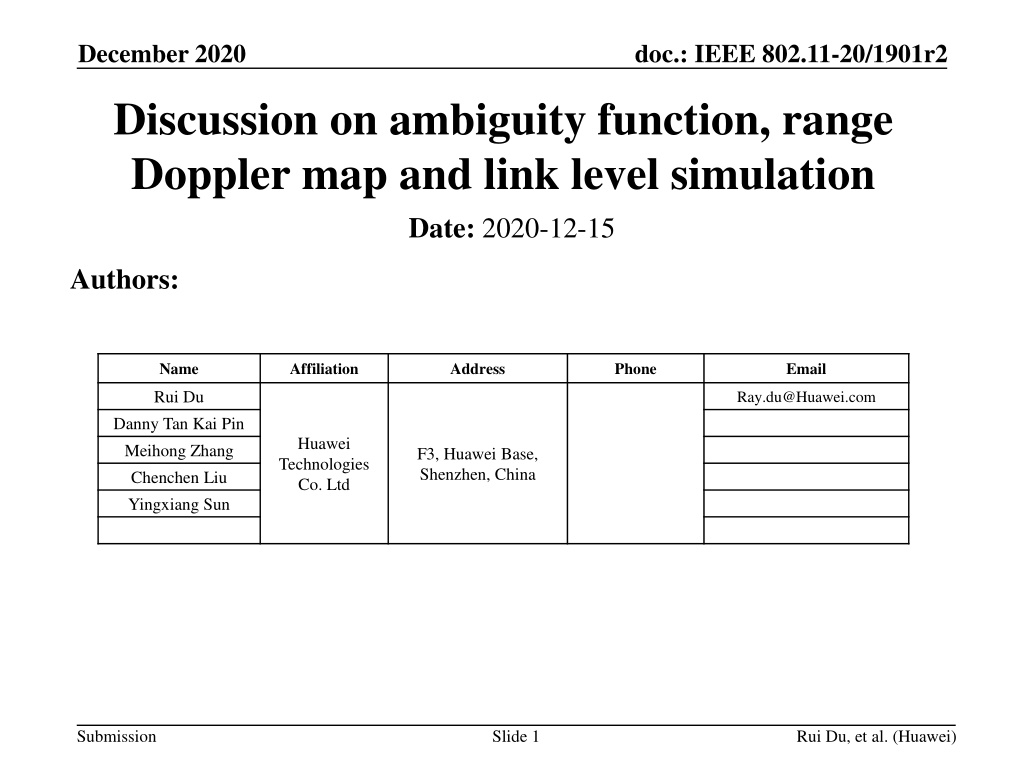 December 2020 doc.: IEEE 802.11-20/1901r2 Discussion on ambiguity function, range Doppler map and link level simulation Date: 2020-12-15 Authors: Name Affiliation Address Phone Email Rui Du Ray.du@Huawei.com Danny Tan Kai Pin Meihong Zhang Chenchen Liu Yingxiang Sun Huawei Technologies Co. Ltd F3, Huawei Base, Shenzhen, China Submission Slide 1 Rui Du, et al. (Huawei)