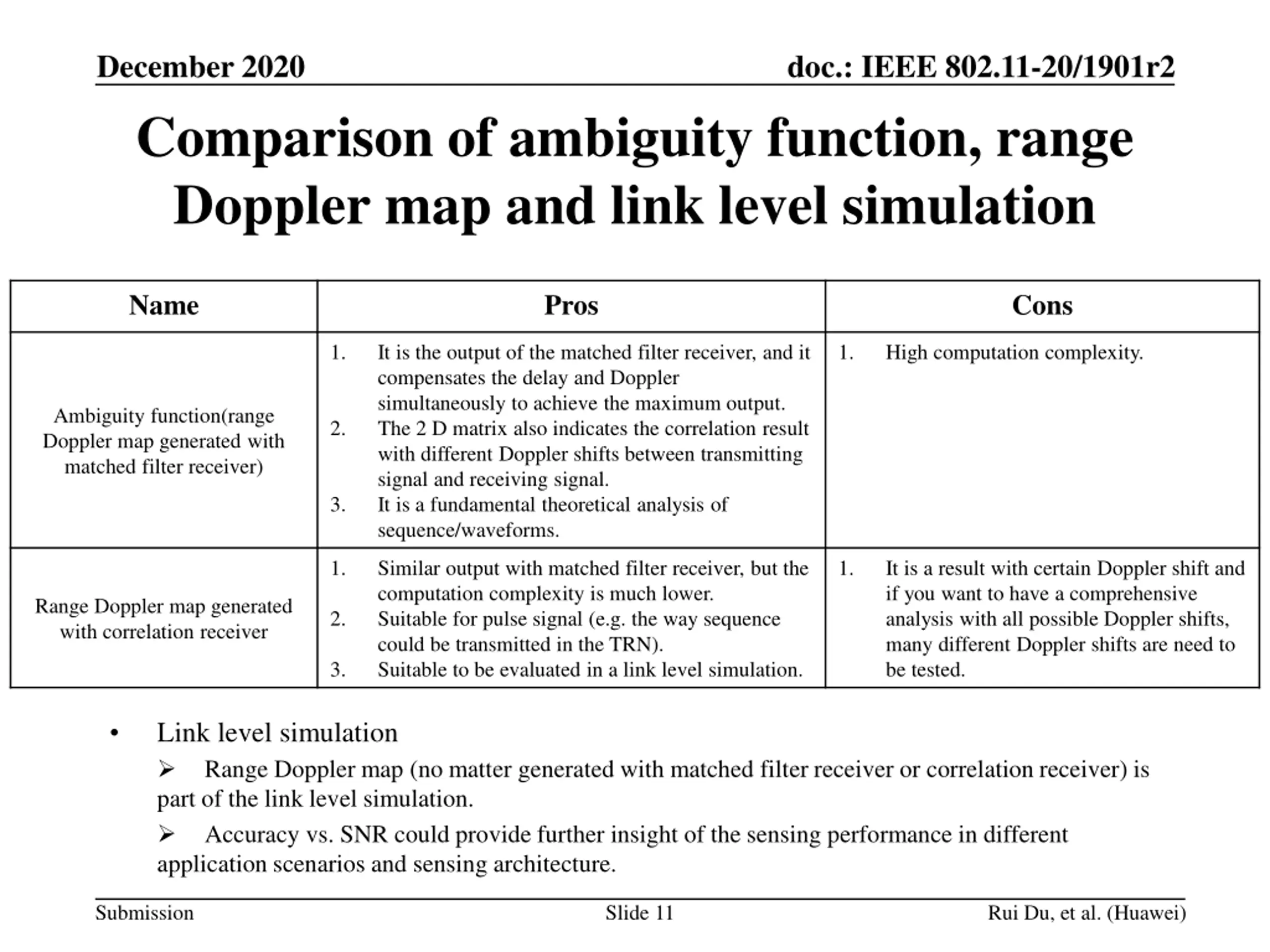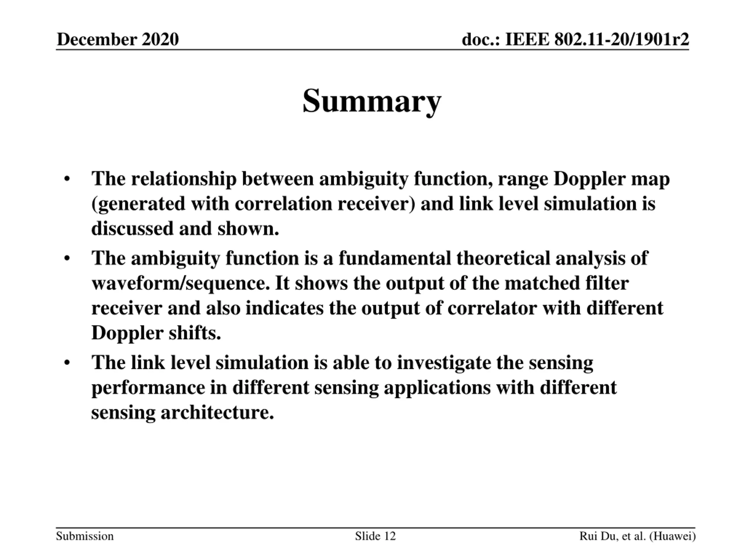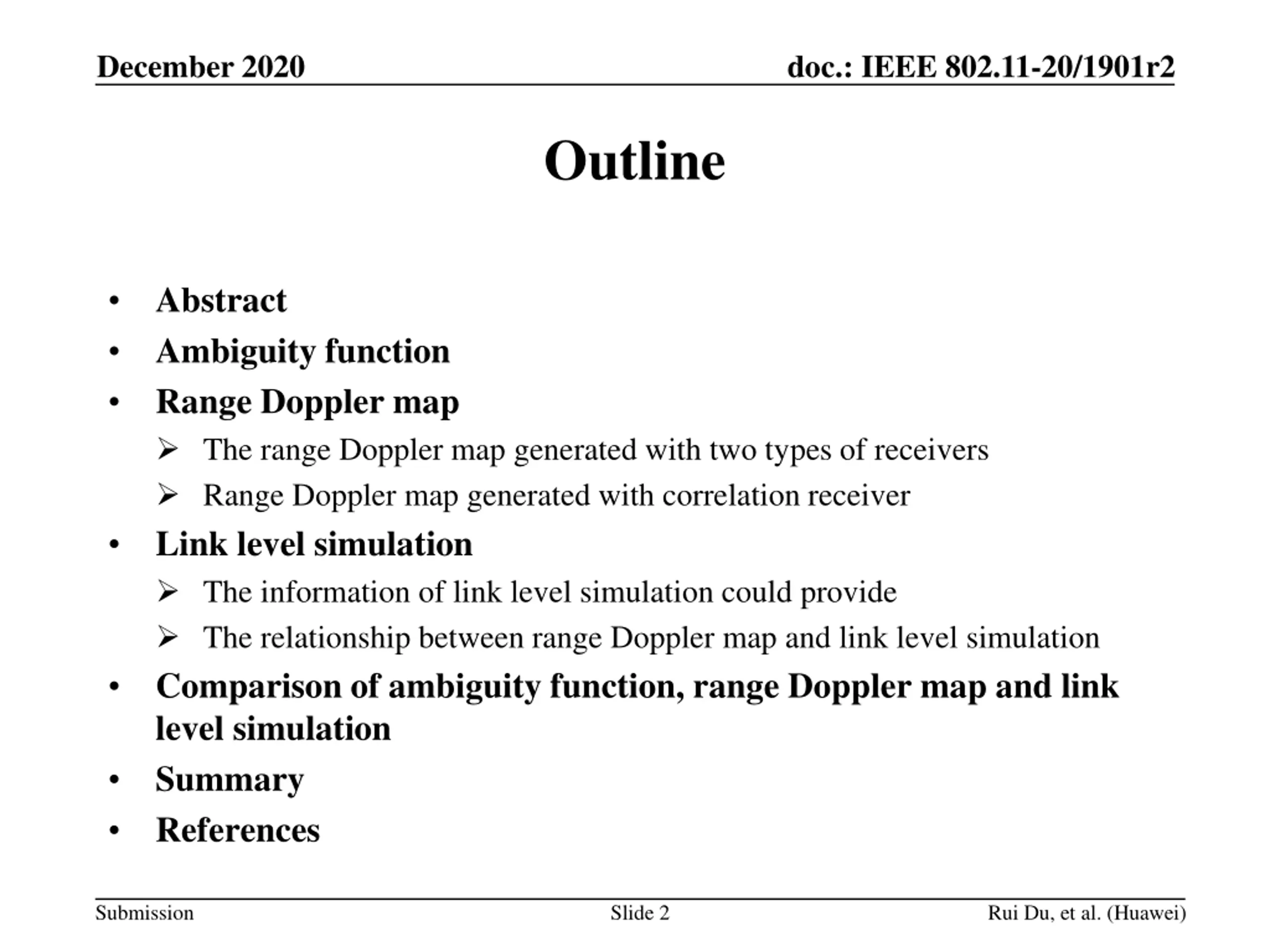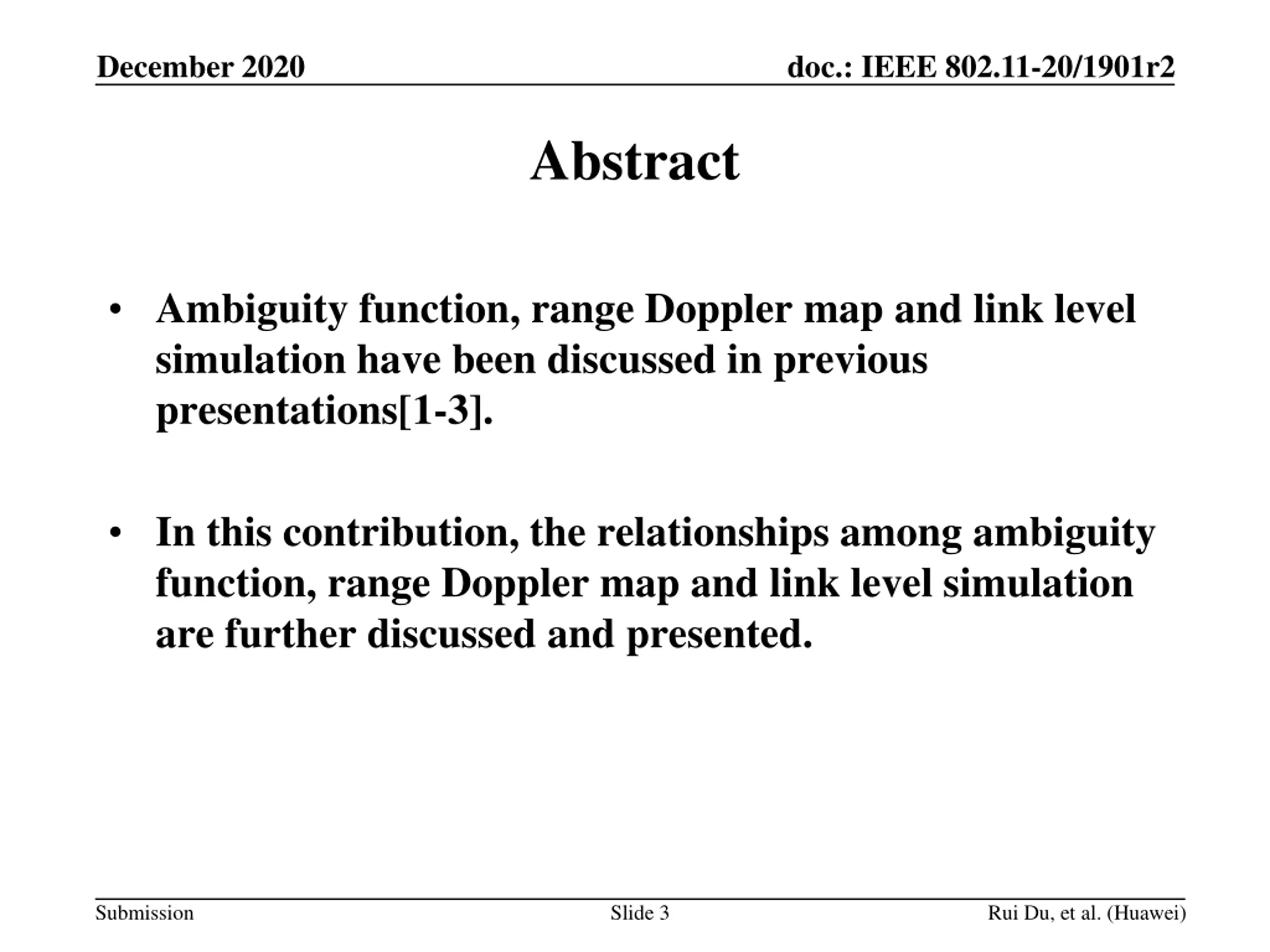 December 2020 doc.: IEEE 802.11-20/1901r2 Abstract Ambiguity function, range Doppler map and link level simulation have been discussed in previous presentations[1-3]. In this contribution, the relationships among ambiguity function, range Doppler map and link level simulation are further discussed and presented. Submission Slide 3 Rui Du, et al. (Huawei)