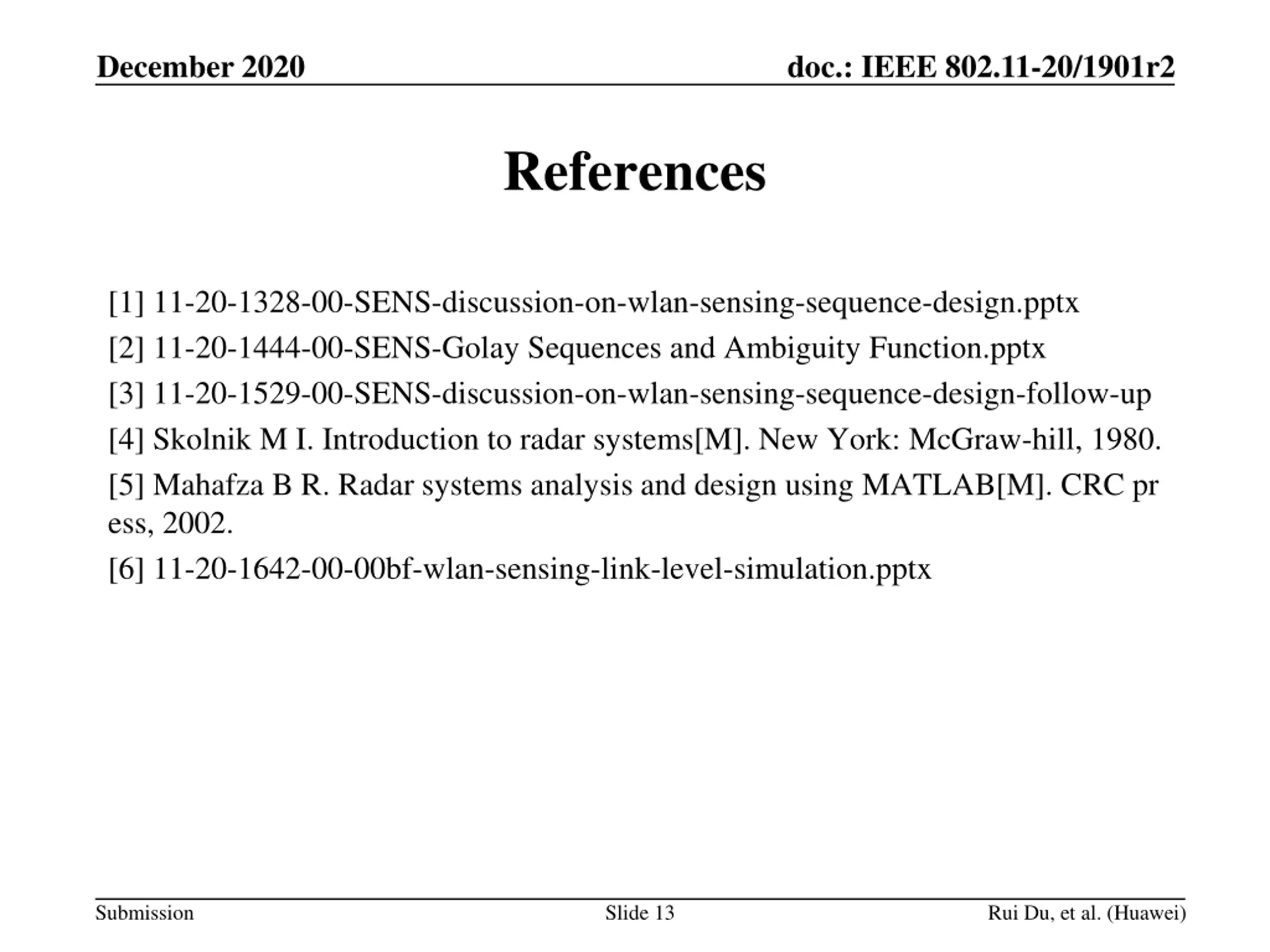 December 2020 doc.: IEEE 802.11-20/1901r2 References [1] 11-20-1328-00-SENS-discussion-on-wlan-sensing-sequence-design.pptx [2] 11-20-1444-00-SENS-Golay Sequences and Ambiguity Function.pptx [3] 11-20-1529-00-SENS-discussion-on-wlan-sensing-sequence-design-follow-up [4] Skolnik M I. Introduction to radar systems[M]. New York: McGraw-hill, 1980. [5] Mahafza B R. Radar systems analysis and design using MATLAB[M]. CRC pr ess, 2002. [6] 11-20-1642-00-00bf-wlan-sensing-link-level-simulation.pptx Submission Slide 13 Rui Du, et al. (Huawei)
